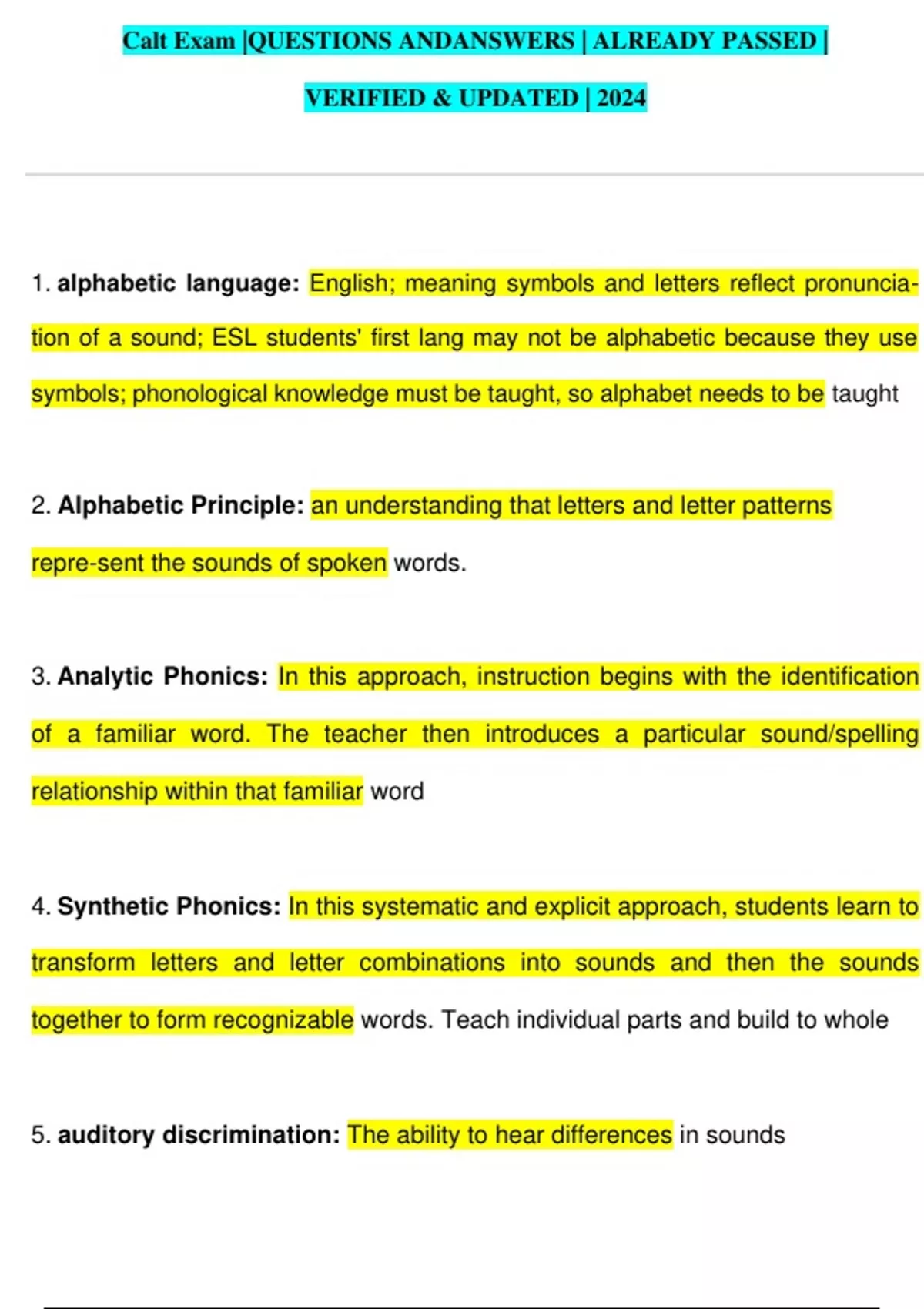 Calt Exam |QUESTIONS ANDANSWERS | ALREADY PASSED | VERIFIED & UPDATED | 2024 1. alphabetic language: English; meaning symbols and letters reflect pronuncia- tion of a sound; ESL students' first lang may not be alphabetic because they use symbols; phonological knowledge must be taught, so alphabet needs to be taught 2. Alphabetic Principle: an understanding that letters and letter patterns repre-sent the sounds of spoken words. 3. Analytic Phonics: In this approach, instruction begins with the identification of a familiar word. The teacher then introduces a particular sound/spelling relationship within that familiar word 4. Synthetic Phonics: In this systematic and explicit approach, students learn to transform letters and letter combinations into sounds and then the sounds together to form recognizable words. Teach individual parts and build to whole 5. auditory discrimination: The ability to hear differences in sounds 6. auditory span: the number of words, numbers, or sounds a student can hold in his working memory. Can limit dictation or note taking.