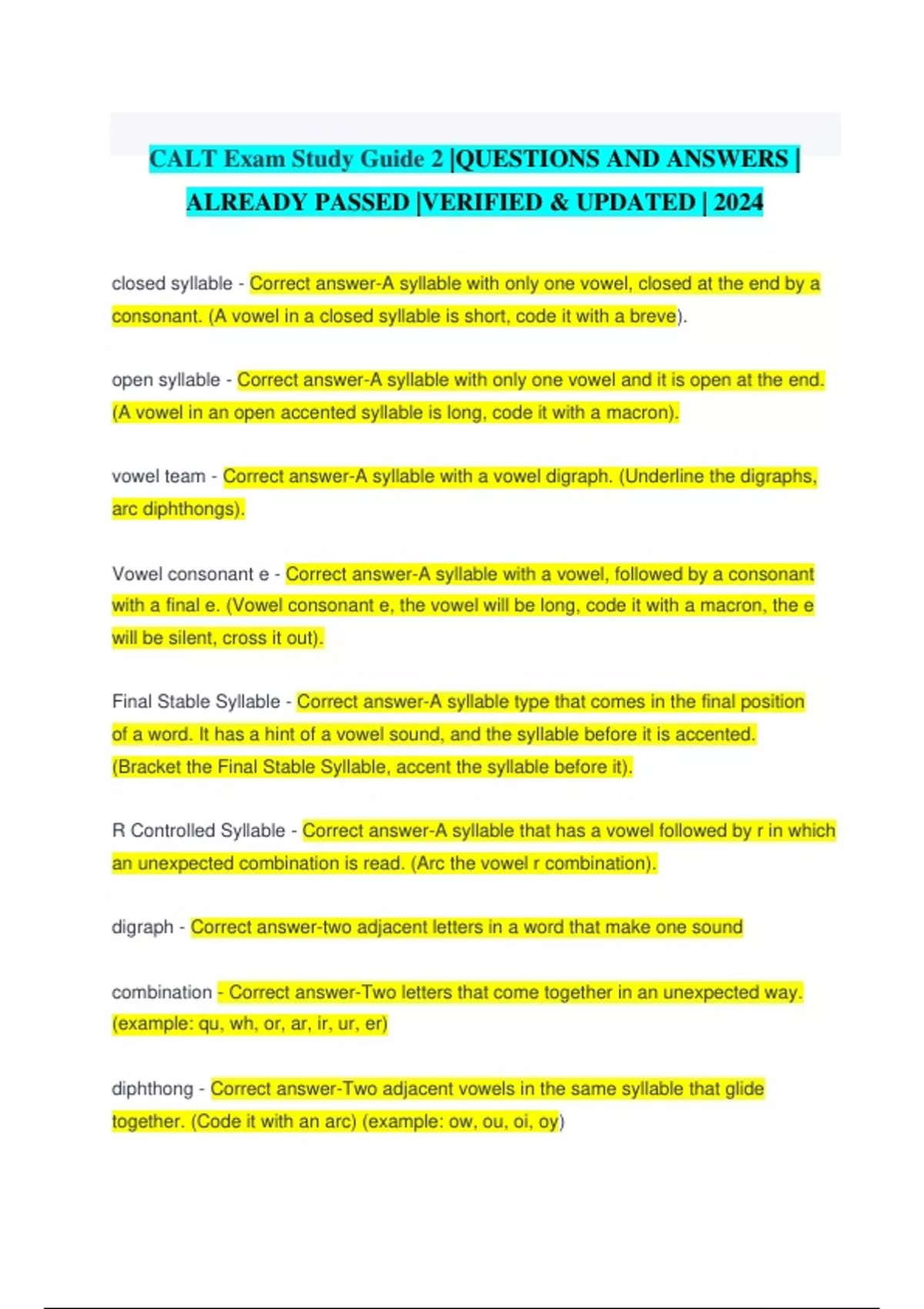 CALT Exam Study Guide 2 |QUESTIONS AND ANSWERS | ALREADY PASSED |VERIFIED & UPDATED | 2024 closed syllable - Correct answer-A syllable with only one vowel, closed at the end by a consonant. (A vowel in a closed syllable is short, code it with a breve). open syllable - Correct answer-A syllable with only one vowel and it is open at the end. (A vowel in an open accented syllable is long, code it with a macron). vowel team - Correct answer-A syllable with a vowel digraph. (Underline the digraphs, arc diphthongs). Vowel consonant e - Correct answer-A syllable with a vowel, followed by a consonant with a final e. (Vowel consonant e, the vowel will be long, code it with a macron, the e will be silent, cross it out). Final Stable Syllable - Correct answer-A syllable type that comes in the final position of a word. It has a hint of a vowel sound, and the syllable before it is accented. (Bracket the Final Stable Syllable, accent the syllable before it). R Controlled Syllable - Correct answer-A syllable that has a vowel followed by r in which an unexpected combination is read. (Arc the vowel r combination). digraph - Correct answer-two adjacent letters in a word that make one sound combination - Correct answer-Two letters that come together in an unexpected way. (example: qu, wh, or, ar, ir, ur, er) diphthong - Correct answer-Two adjacent vowels in the same syllable that glide together. (Code it with an arc) (example: ow, ou, oi, oy)