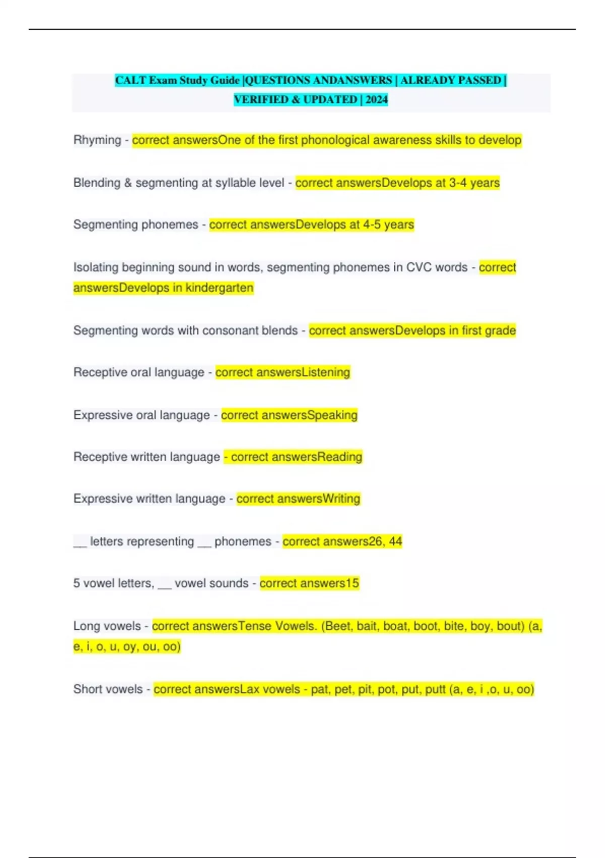 CALT Exam Study Guide |QUESTIONS ANDANSWERS | ALREADY PASSED | VERIFIED & UPDATED | 2024 Rhyming - correct answersOne of the first phonological awareness skills to develop Blending & segmenting at syllable level - correct answersDevelops at 3-4 years Segmenting phonemes - correct answersDevelops at 4-5 years Isolating beginning sound in words, segmenting phonemes in CVC words - correct answersDevelops in kindergarten Segmenting words with consonant blends - correct answersDevelops in first grade Receptive oral language - correct answersListening Expressive oral language - correct answersSpeaking Receptive written language - correct answersReading Expressive written language - correct answersWriting __ letters representing __ phonemes - correct answers26, 44 5 vowel letters, __ vowel sounds - correct answers15 Long vowels - correct answersTense Vowels. (Beet, bait, boat, boot, bite, boy, bout) (a, e, i, o, u, oy, ou, oo) Short vowels - correct answersLax vowels - pat, pet, pit, pot, put, putt (a, e, i ,o, u, oo)