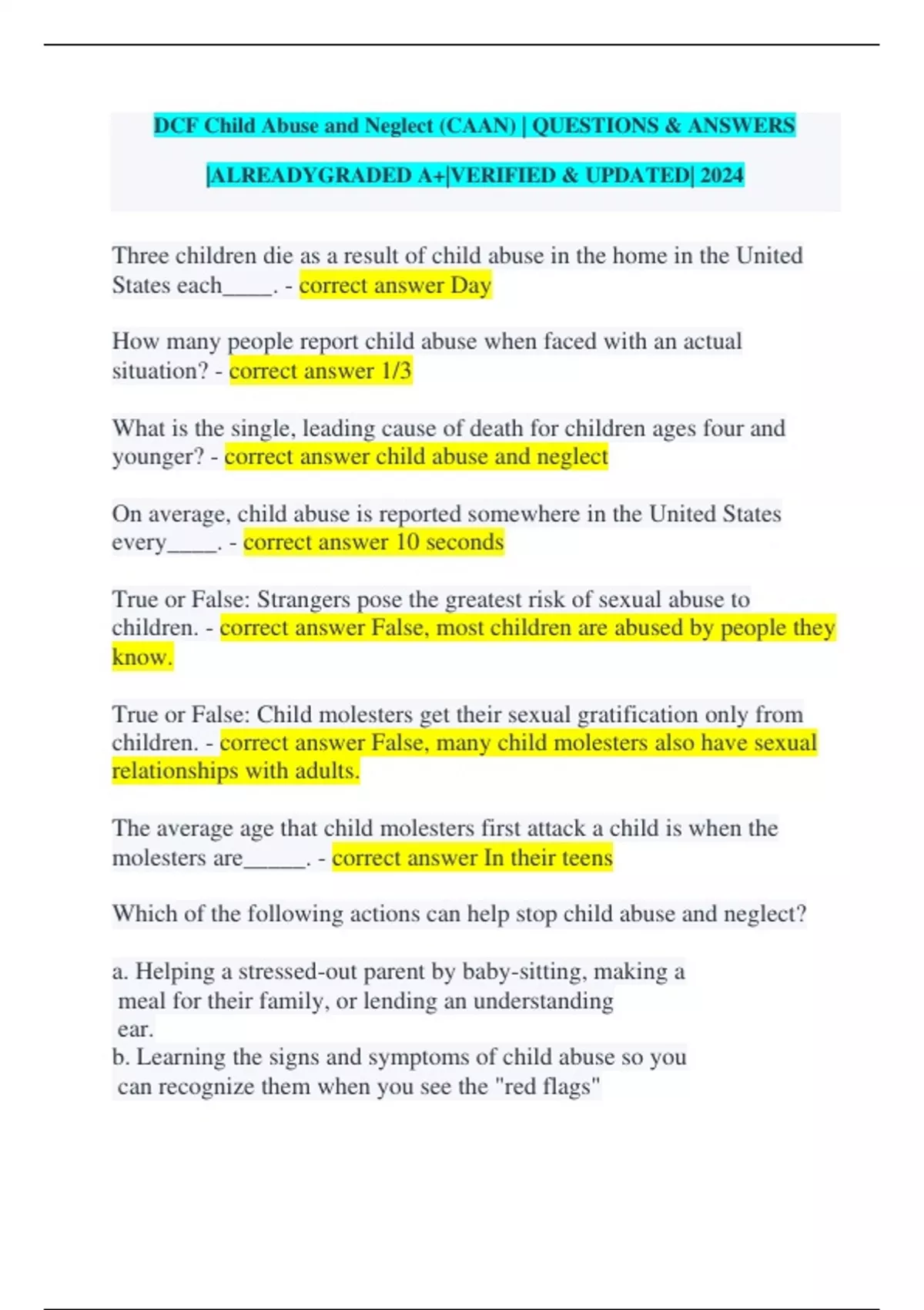 DCF Child Abuse and Neglect (CAAN) | QUESTIONS & ANSWERS |ALREADYGRADED A+|VERIFIED & UPDATED| 2024 Three children die as a result of child abuse in the home in the United States each____. - correct answer Day How many people report child abuse when faced with an actual situation? - correct answer 1/3 What is the single, leading cause of death for children ages four and younger? - correct answer child abuse and neglect On average, child abuse is reported somewhere in the United States every____. - correct answer 10 seconds True or False: Strangers pose the greatest risk of sexual abuse to children. - correct answer False, most children are abused by people they know. True or False: Child molesters get their sexual gratification only from children. - correct answer False, many child molesters also have sexual relationships with adults. The average age that child molesters first attack a child is when the molesters are_____. - correct answer In their teens Which of the following actions can help stop child abuse and neglect? a. Helping a stressed-out parent by baby-sitting, making a meal for their family, or lending an understanding ear. b. Learning the signs and symptoms of child abuse so you can recognize them when you see the "red flags"