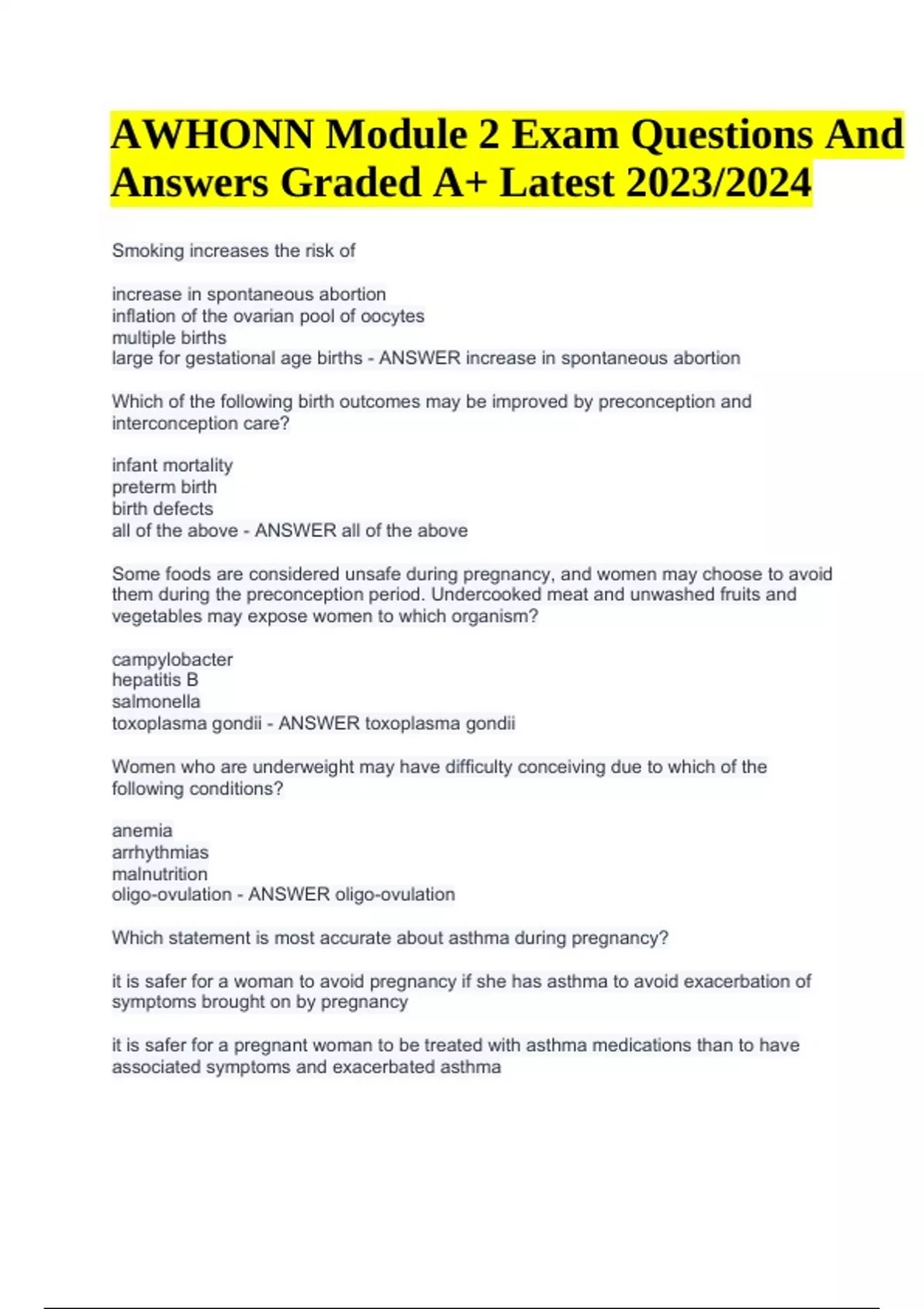 AWHONN Module 2 Exam Questions And Answers Graded A+ Latest 2023/2024. Smoking increases the risk of increase in spontaneous abortion inflation of the ovarian pool of oocytes multiple births large for gestational age births - ANSWER increase in spontaneous abortion Which of the following birth outcomes may be improved by preconception and interconception care? infant mortality preterm birth birth defects all of the above - ANSWER all of the above Some foods are considered unsafe during pregnancy, and women may choose to avoid them during the preconception period. Undercooked meat and unwashed fruits and vegetables may expose women to which organism? campylobacter hepatitis B salmonella toxoplasma gondii - ANSWER toxoplasma gondii Women who are underweight may have difficulty conceiving due to which of the following conditions? anemia arrhythmias malnutrition oligo-ovulation - ANSWER oligo-ovulation Which statement is most accurate about asthma during pregnancy? it is safer for a woman to avoid pregnancy if she has asthma to avoid exacerbation of symptoms brought on by pregnancy it is safer for a pregnant woman to be treated with asthma medications than to have associated symptoms and exacerbated asthma