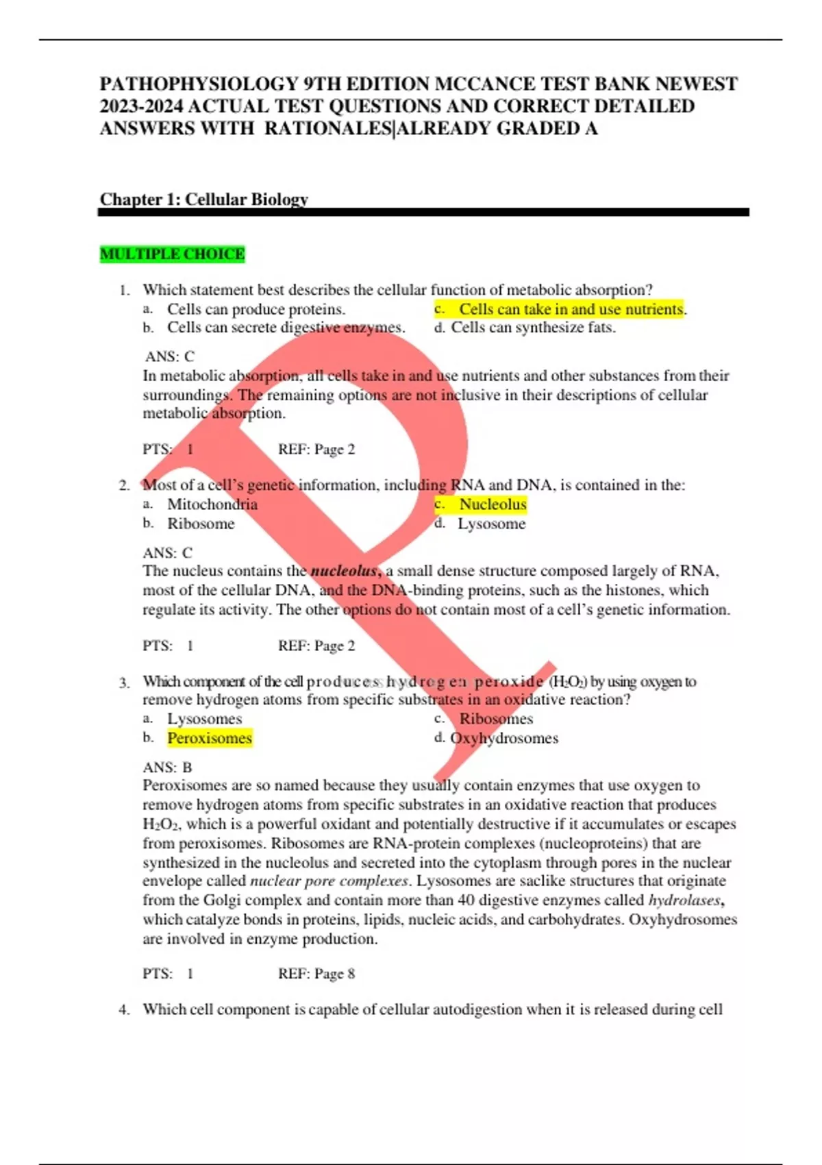 PATHOPHYSIOLOGY 9TH EDITION MCCANCE TEST BANK NEWEST ACTUAL TEST QUESTIONS AND CORRECT DETAILED ANSWERS WITH RATIONALES|ALREADY GRADED A Chapter 1: Cellular Biology MULTIPLE CHOICE 1. Which statement best describes the cellular function of metabolic absorption? a. Cells can produce proteins. c. Cells can take in and use nutrients. b. Cells can secrete digestive enzymes. d. Cells can synthesize fats. ANS: C In metabolic absorption, all cells take in and use nutrients and other substances from their surroundings. The remaining options are not inclusive in their descriptions of cellular metabolic absorption. PTS: 1 REF: Page 2 2. Most of a cell’s genetic information, including RNA and DNA, is contained in the: a. Mitochondria c. Nucleolus b. Ribosome d. Lysosome ANS: C The nucleus contains the nucleolus, a small dense structure composed largely of RNA, most of the cellular DNA, and the DNA-binding proteins, such as the histones, which regulate its activity. The other options do not contain most of a cell’s genetic information. PTS: 1 REF: Page 2 3. Which component ofthe cell prodNuUceRsSIhNyGdTroBg.CenO Mperoxide (H2O2) byusing oxygen to remove hydrogen atoms from specific substrates in an oxidative reaction? a. Lysosomes c. Ribosomes b. Peroxisomes d. Oxyhydrosomes ANS: B Peroxisomes are so named because they usually contain enzymes that use oxygen to remove hydrogen atoms from specific substrates in an oxidative reaction that produces H2O2, which is a powerful oxidant and potentially destructive if it accumulates or escapes from peroxisomes. Ribosomes are RNA-protein complexes (nucleoproteins) that are synthesized in the nucleolus and secreted into the cytoplasm through pores in the nuclear envelope called nuclear pore complexes. Lysosomes are saclike structures that originate from the Golgi complex and contain more than 40 digestive enzymes called hydrolases, which catalyze bonds in proteins, lipids, nucleic acids, and carbohydrates. Oxyhydrosomes are involved in enzyme production. PTS: 1 REF: Page 8 4. Which cell component is capable of cellular autodigestion when it is released during cell injury? a. Ribosome c. Smooth endoplasmic reticulum b. Golgi complex d. Lysosomes ANS: D The lysosomal membrane acts as a protective shield between the powerful digestive enzymes within the lysosome and the cytoplasm, preventing their leakage into the cytoplasmic matrix. Disruption of the membrane by various treatments or cellular injury leads to a release of the lysosomal enzymes, which can then react with their specific substrates, causing cellular self-digestion. The other options do not correctly describe this process. PTS: 1 REF: Pages 7-8 5. What is the sequence of steps in the development of a digestive enzyme by the pancreas cells from the initial transcription to the release from the cell? a. The enzyme is transcribed from DNA by RNA in the nucleus, proceeds to the ribosome for synthesis, and is transported in a secretory vesicle to the cell membrane. b. The enzyme is transcribed from RNA by DNA in the nucleus, proceeds to the lysosome for synthesis, and is transported in an encapsulated membrane to the cell membrane. c. The enzyme is transcribed by the mitochondria in the nucleus, proceeds to the ribosome for synthesis, and is transported in a cytoskeleton to the cell membrane. d. The enzyme is transcribed from DNA by RNA in the nucleus, proceeds to the Golgi complex forsynthesis, and is transported in a cytosol to the cell membrane. ANS: A The enzyme is transcribed from DNA by RNA in the nucleus, proceeds to the ribosome for synthesis, and is transported in a secretory vesicle to the cell membrane. The other options do not correctly describe this process. NURSINGTB.COM PTS: 1 REF: Page 7 | Figure 1-5 6. During which phase of the cell cycle is DNA synthesized? a. G1 c. G2 b. S d. M ANS: B The four designated phases of the cell cycle are: (1) the G1 phase (G = gap), which is the period between the M phase (M = mitosis) and the start of DNA synthesis; (2) the S phase (S = synthesis), during which DNA is synthesized in the cell nucleus; (3) the G2 phase, during which RNA and protein synthesis occurs, the period between the completion of DNA synthesis and the next phase (M); and (4) the M phase, which includes nuclear and cytoplasmic division. PTS: 1 REF: Page 37 7. What organic compound facilitates transportation across cell membranes by acting as receptors, transport channels for electrolytes, and enzymes to drive active pumps? a. Lipids c. Proteins b. Proteases d. Carbohydrates