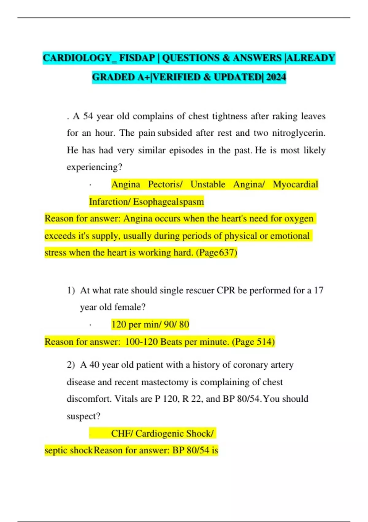 CARDIOLOGY_ FISDAP | QUESTIONS & ANSWERS |ALREADY GRADED A+|VERIFIED & UPDATED| 2024 . A 54 year old complains of chest tightness after raking leaves for an hour. The pain subsided after rest and two nitroglycerin. He has had very similar episodes in the past. He is most likely experiencing? · Angina Pectoris/ Unstable Angina/ Myocardial Infarction/ Esophageal spasm Reason for answer: Angina occurs when the heart's need for oxygen exceeds it's supply, usually during periods of physical or emotional stress when the heart is working hard. (Page 637) 1) At what rate should single rescuer CPR be performed for a 17 year old female? · 120 per min/ 90/ 80 Reason for answer: 100-120 Beats per minute. (Page 514) 2) A 40 year old patient with a history of coronary artery disease and recent mastectomy is complaining of chest discomfort. Vitals are P 120, R 22, and BP 80/54. You should suspect? · CHF/ Cardiogenic Shock/ septic shock Reason for answer: BP 80/54 is