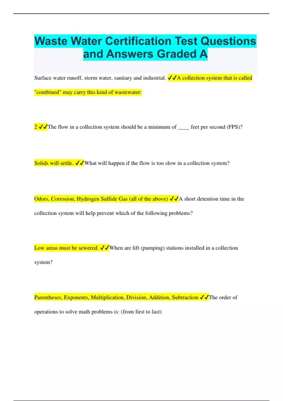 Surface water runoff, storm water, sanitary and industrial. A collection system that is called "combined" may carry this kind of wastewater: 2 The flow in a collection system should be a minimum of ____ feet per second (FPS)? Solids will settle. What will happen if the flow is too slow in a collection system? Odors, Corrosion, Hydrogen Sulfide Gas (all of the above) A short detention time in the collection system will help prevent which of the following problems? Low areas must be sewered. When are lift (pumping) stations installed in a collection system? Parentheses, Exponents, Multiplication, Division, Addition, Subtraction The order of operations to solve math problems is: (from first to last)
