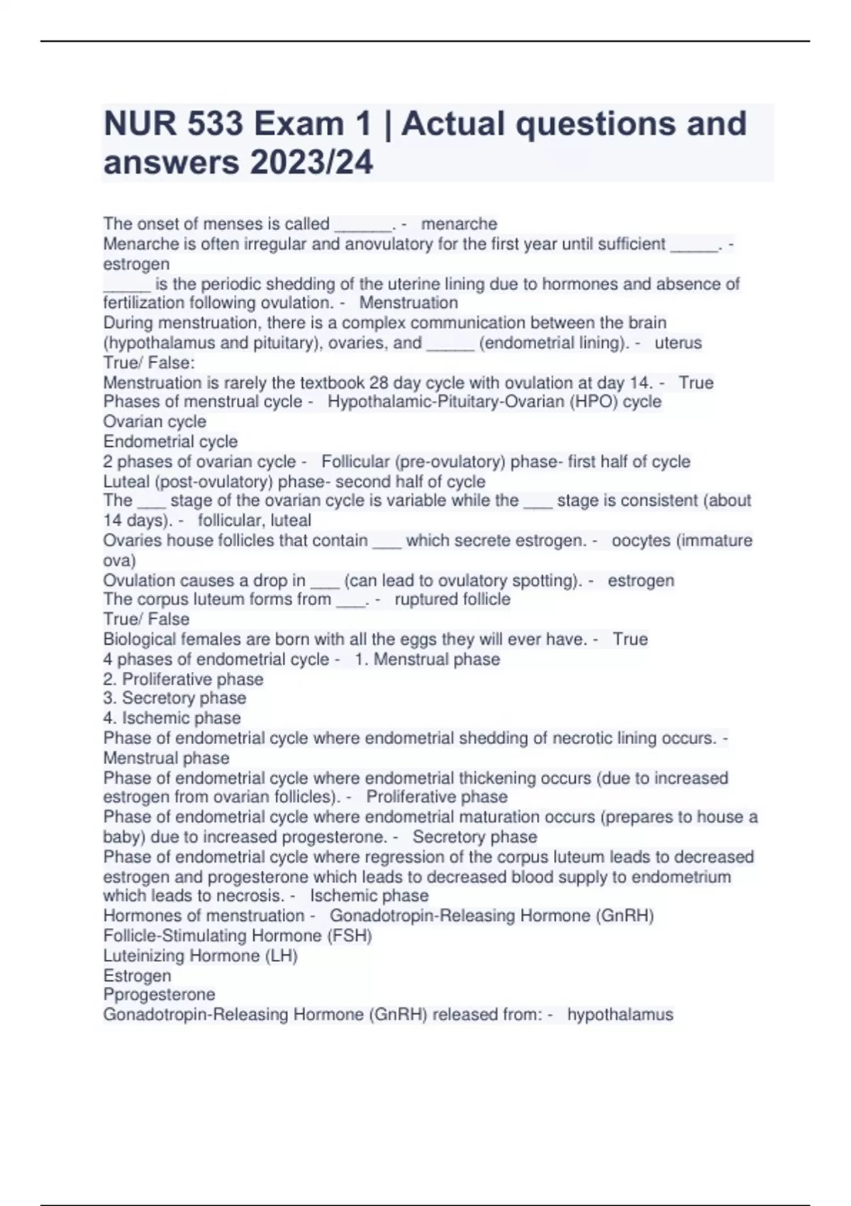 NUR 533 Exam 1 | Actual questions and answers 2023/24 The onset of menses is called ______. - menarche Menarche is often irregular and anovulatory for the first year until sufficient _____. - estrogen _____ is the periodic shedding of the uterine lining due to hormones and absence of fertilization following ovulation. - Menstruation During menstruation, there is a complex communication between the brain (hypothalamus and pituitary), ovaries, and _____ (endometrial lining). - uterus True/ False: Menstruation is rarely the textbook 28 day cycle with ovulation at day 14. - True Phases of menstrual cycle - Hypothalamic-Pituitary-Ovarian (HPO) cycle Ovarian cycle Endometrial cycle 2 phases of ovarian cycle - Follicular (pre-ovulatory) phase- first half of cycle Luteal (post-ovulatory) phase- second half of cycle The ___ stage of the ovarian cycle is variable while the ___ stage is consistent (about 14 days). - follicular, luteal Ovaries house follicles that contain ___ which secrete estrogen. - oocytes (immature ova) Ovulation causes a drop in ___ (can lead to ovulatory spotting). - estrogen