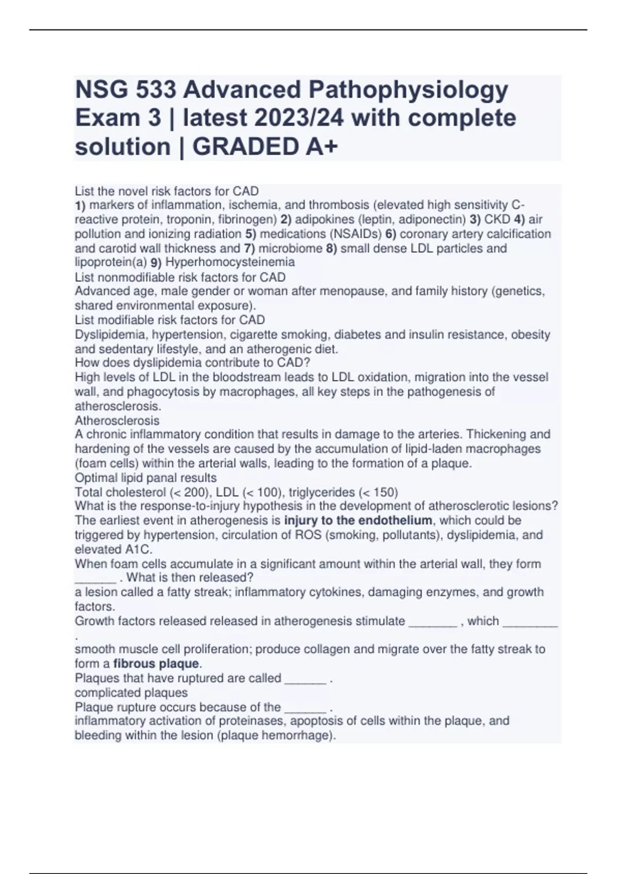 NSG 533 Advanced Pathophysiology Exam 3 | latest 2023/24 with complete solution | GRADED A+ List the novel risk factors for CAD 1) markers of inflammation, ischemia, and thrombosis (elevated high sensitivity C-reactive protein, troponin, fibrinogen) 2) adipokines (leptin, adiponectin) 3) CKD 4) air pollution and ionizing radiation 5) medications (NSAIDs) 6) coronary artery calcification and carotid wall thickness and 7) microbiome 8) small dense LDL particles and lipoprotein(a) 9) Hyperhomocysteinemia List nonmodifiable risk factors for CAD Advanced age, male gender or woman after menopause, and family history (genetics, shared environmental exposure). List modifiable risk factors for CAD Dyslipidemia, hypertension, cigarette smoking, diabetes and insulin resistance, obesity and sedentary lifestyle, and an atherogenic diet. How does dyslipidemia contribute to CAD? High levels of LDL in the bloodstream leads to LDL oxidation, migration into the vessel wall, and phagocytosis by macrophages, all key steps in the pathogenesis of atherosclerosis. Atherosclerosis A chronic inflammatory condition that results in damage to the arteries. Thickening and