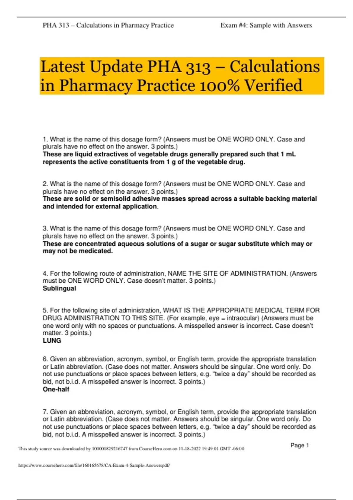 Latest Update PHA 313 – Calculations in Pharmacy Practice 100% Verified
