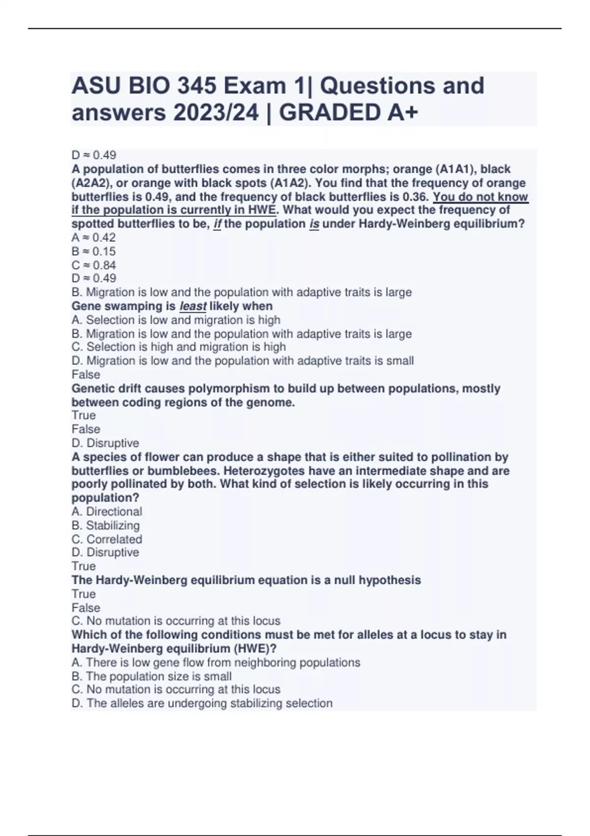 ASU BIO 345 Exam 1| Questions and answers 2023/24 | GRADED A+ D ≈ 0.49 A population of butterflies comes in three color morphs; orange (A1A1), black (A2A2), or orange with black spots (A1A2). You find that the frequency of orange butterflies is 0.49, and the frequency of black butterflies is 0.36. You do not know if the population is currently in HWE. What would you expect the frequency of spotted butterflies to be, if the population is under Hardy-Weinberg equilibrium? A ≈ 0.42 B ≈ 0.15 C ≈ 0.84 D ≈ 0.49 B. Migration is low and the population with adaptive traits is large Gene swamping is least likely when A. Selection is low and migration is high B. Migration is low and the population with adaptive traits is large C. Selection is high and migration is high D. Migration is low and the population with adaptive traits is small False Genetic drift causes polymorphism to build up between populations, mostly between coding regions of the genome. True False D. Disruptive A species of flower can produce a shape that is either suited to pollination by butterflies or bumblebees. Heterozygotes have an intermediate shape and are poorly pollinated by both. What kind of selection is likely occurring in this population? A. Directional B. Stabilizing C. Correlated D. Disruptive True The Hardy-Weinberg equilibrium equation is a null hypothesis True False C. No mutation is occurring at this locus Which of the following conditions must be met for alleles at a locus to stay in Hardy-Weinberg equilibrium (HWE)? A. There is low gene flow from neighboring populations B. The population size is small C. No mutation is occurring at this locus D. The alleles are undergoing stabilizing selection E. Females prefer males that are homozygous recessive for an allele True Natural selection can act on non-inherited features of the phenotype True False False A founder event populates a small nearby island with a new species of lizard. This lizard comes in two color morphs controlled by alleles D1 and D2, giving it blue spots or green spots. Neither color gives a fitness advantage. The two color morphs will likely stay in HWE. True False A. Allowing an allele that confers better fitness to spread more quickly than it would through only natural selection Genetic drift can work against natural selection, but it can also help it by: A. Allowing an allele that confers better fitness to spread more quickly than it would through only natural selection B. Genetic drift only works against natural selection C. Causing adaptive changes D. Increasing migration B. The female must be able to see the blue color under the fur Some males in a population of wild dogs have blue skin. What must necessarily be true for the trait to evolve under sexual selection though female choice? A. The trait must be enhanced in males that are best at providing food for their young B. The female must be able to see the blue color under the fur C. The trait must help the male hide from predators D. The trait must help the male protect its territory from other males B. ≈690 A population of fish has two alleles for fin color, O (orange) or o (blue). The o allele is recessive. If there are 30 homozygous (OO) orange-finned fish in a population of 1,000, how many have blue fins? Assume the population is at Hardy-Weinberg equilibrium. A. ≈170 B. ≈690 C. ≈830 D. ≈282 True A deleterious mutation is more likely to go to fixation in a small rather than large population True False B. FST would be near 0, the populations are likely genetically similar FST is a measure of genetic divergence between populations. If there are one or more migrants between populations per generation, and selection is not affecting the populations differently, what would you expect in terms of FST and genetic divergence?