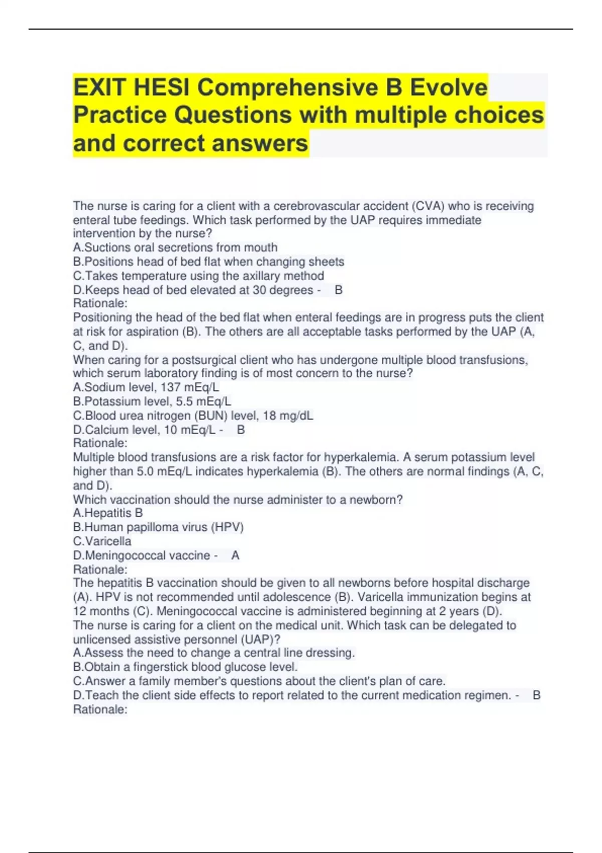 EXIT HESI Comprehensive B Evolve Practice Questions with multiple choices and correct answers The nurse is caring for a client with a cerebrovascular accident (CVA) who is receiving enteral tube feedings. Which task performed by the UAP requires immediate intervention by the nurse? A.Suctions oral secretions from mouth B.Positions head of bed flat when changing sheets C.Takes temperature using the axillary method D.Keeps head of bed elevated at 30 degrees - B Rationale: Positioning the head of the bed flat when enteral feedings are in progress puts the client at risk for aspiration (B). The others are all acceptable tasks performed by the UAP (A, C, and D). When caring for a postsurgical client who has undergone multiple blood transfusions, which serum laboratory finding is of most concern to the nurse? A.Sodium level, 137 mEq/L B.Potassium level, 5.5 mEq/L C.Blood urea nitrogen (BUN) level, 18 mg/dL D.Calcium level, 10 mEq/L - B Rationale: Multiple blood transfusions are a risk factor for hyperkalemia. A serum potassium level higher than 5.0 mEq/L indicates hyperkalemia (B). The others are normal findings (A, C, and D). Which vaccination should the nurse administer to a newborn? A.Hepatitis B B.Human papilloma virus (HPV) C.Varicella D.Meningococcal vaccine - A Rationale: The hepatitis B vaccination should be given to all newborns before hospital discharge (A). HPV is not recommended until adolescence (B). Varicella immunization begins at 12 months (C). Meningococcal vaccine is administered beginning at 2 years (D). The nurse is caring for a client on the medical unit. Which task can be delegated to unlicensed assistive personnel (UAP)? A.Assess the need to change a central line dressing. B.Obtain a fingerstick blood glucose level. C.Answer a family member's questions about the client's plan of care. D.Teach the client side effects to report related to the current medication regimen. - B Rationale: Obtaining a fingerstick blood glucose level is a simple treatment and is an appropriate skill for UAP to perform (B). (A, C, and D) are skills that cannot be delegated to UAP. The nurse is caring for a client with an ischemic stroke who has a prescription for tissue plasminogen activator (t-PA) IV. Which action(s) should the nurse expect to implement? (Select all that apply.) A.Administer aspirin with tissue plasminogen activator (t-PA). B.Complete the National Institute of Health Stroke Scale (NIHSS). C.Assess the client for signs of bleeding during and after the infusion. D.Start t-PA within 6 hours after the onset of stroke symptoms. E.Initiate multidisciplinary consult for potential rehabilitation. - B,C,E Rationale: Neurologic assessment, including the NIHSS, is indicated for the client receiving t-PA. This includes close monitoring for bleeding during and after the infusion; if bleeding or other signs of neurologic