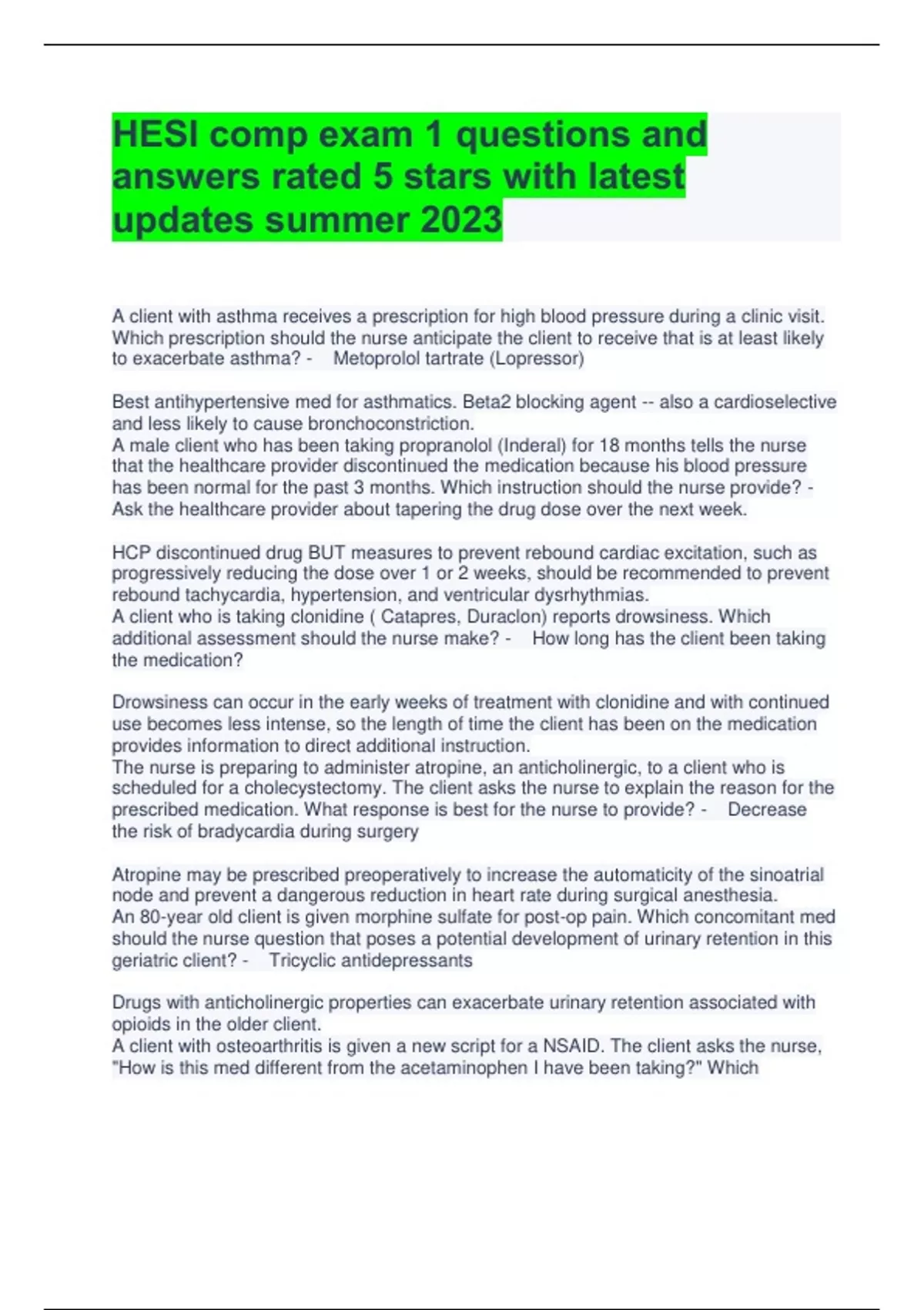 HESI comp exam 1 questions and answers rated 5 stars with latest updates summer 2023 A client with asthma receives a prescription for high blood pressure during a clinic visit. Which prescription should the nurse anticipate the client to receive that is at least likely to exacerbate asthma? - Metoprolol tartrate (Lopressor) Best antihypertensive med for asthmatics. Beta2 blocking agent -- also a cardioselective and less likely to cause bronchoconstriction. A male client who has been taking propranolol (Inderal) for 18 months tells the nurse that the healthcare provider discontinued the medication because his blood pressure has been normal for the past 3 months. Which instruction should the nurse provide? - Ask the healthcare provider about tapering the drug dose over the next week. HCP discontinued drug BUT measures to prevent rebound cardiac excitation, such as progressively reducing the dose over 1 or 2 weeks, should be recommended to prevent rebound tachycardia, hypertension, and ventricular dysrhythmias. A client who is taking clonidine ( Catapres, Duraclon) reports drowsiness. Which additional assessment should the nurse make? - How long has the client been taking the medication? Drowsiness can occur in the early weeks of treatment with clonidine and with continued use becomes less intense, so the length of time the client has been on the medication provides information to direct additional instruction. The nurse is preparing to administer atropine, an anticholinergic, to a client who is scheduled for a cholecystectomy. The client asks the nurse to explain the reason for the prescribed medication. What response is best for the nurse to provide? - Decrease the risk of bradycardia during surgery Atropine may be prescribed preoperatively to increase the automaticity of the sinoatrial node and prevent a dangerous reduction in heart rate during surgical anesthesia. An 80-year old client is given morphine sulfate for post-op pain. Which concomitant med should the nurse question that poses a potential development of urinary retention in this geriatric client? - Tricyclic antidepressants Drugs with anticholinergic properties can exacerbate urinary retention associated with opioids in the older client. A client with osteoarthritis is given a new script for a NSAID. The client asks the nurse, "How is this med different from the acetaminophen I have been taking?" Which information about the therapeutic action of NSAIDs should the nurse provide? - Provide anti-inflammatory response NSAIDs relieve pain associated with osteoarthritis and differs from acetaminophen(a non-narcotic & antipyretic). Also potentially hepatotoxic. A client with cancer has a history of alcohol abuse and is taking acetaminophen (Tylenol) for pain. Which organ function is most important for the nurse to monitor? - Liver Acetaminophen & alcohol both metabolized in the liver. Pt at risk of hepatotoxicity & potentially fatal liver damage. The nurse obtains a heart rate of 92 and a BP of 110/76 prior to administering a scheduled does of verapamil (Calan) for a client with atrial flutter. Which action should the nurse implement? - Administer the dose as prescribed. Verapamil slows SA nodal automaticity, del