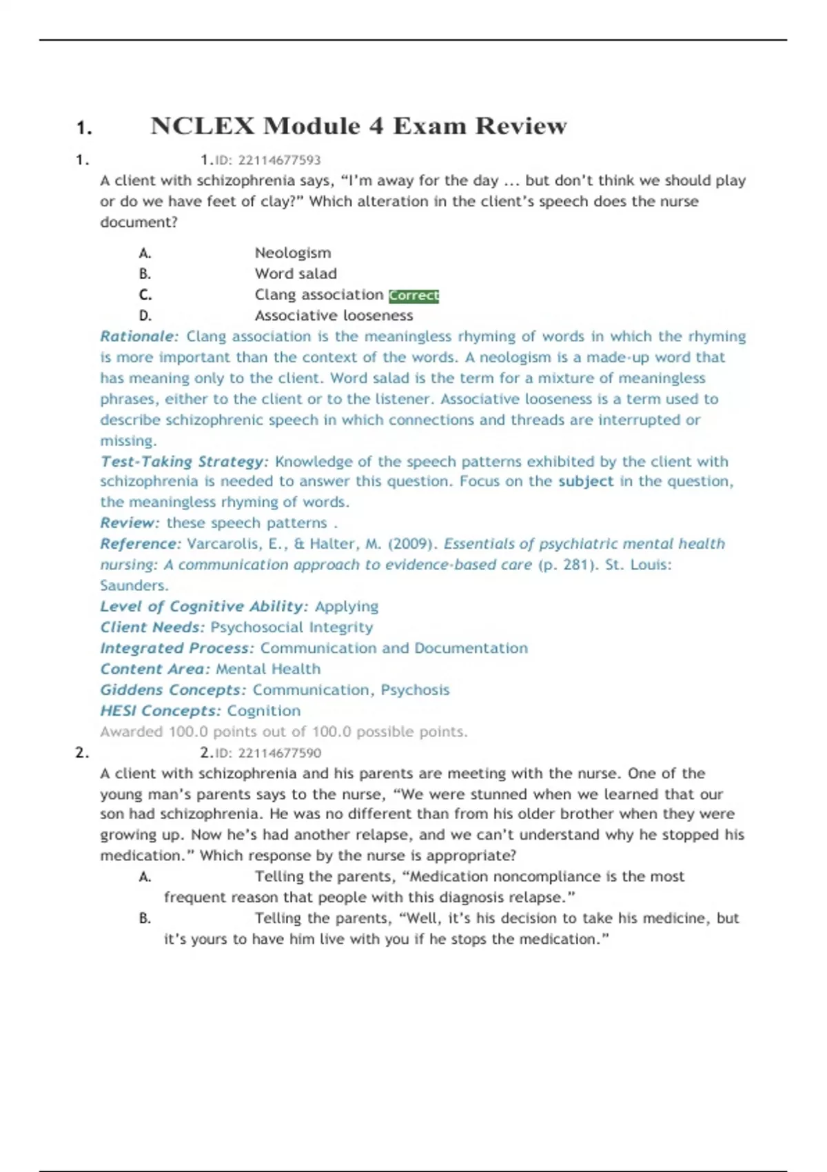 1. NCLEX Module 4 Exam Review 1. 1.ID: A client with schizophrenia says, “I’m away for the day ... but don’t think we should play or do we have feet of clay?” Which alteration in the client’s speech does the nurse document? A. Neologism B. Word salad C. Clang association Correct D. Associative looseness Rationale: Clang association is the meaningless rhyming of words in which the rhyming is more important than the context of the words. A neologism is a made-up word that has meaning only to the client. Word salad is the term for a mixture of meaningless phrases, either to the client or to the listener. Associative looseness is a term used to describe schizophrenic speech in which connections and threads are interrupted or missing. Test-Taking Strategy: Knowledge of the speech patterns exhibited by the client with schizophrenia is needed to answer this question. Focus on the subject in the question, the meaningless rhyming of words. Review: these speech patterns . Reference: Varcarolis, E., & Halter, M. (2009). Essentials of psychiatric mental health nursing: A communication approach to evidence-based care (p. 281). St. Louis: Saunders. Level of Cognitive Ability: Applying Client Needs: Psychosocial Integrity Integrated Process: Communication and Documentation Content Area: Mental Health Giddens Concepts: Communication, Psychosis HESI Concepts: Cognition Awarded 100.0 points out of 100.0 possible points. 2. 2.ID: A client with schizophrenia and his parents are meeting with the nurse. One of the young man’s parents says to the nurse, “We were stunned when we learned that our son had schizophrenia. He was no different than from his older brother when they were growing up. Now he’s had another relapse, and we can’t understand why he stopped his medication.” Which response by the nurse is appropriate? A. Telling the parents, “Medication noncompliance is the most frequent reason that people with this diagnosis relapse.” B. Telling the parents, “Well, it’s his decision to take his medicine, but it’s yours to have him live with you if he stops the medication.” C. Asking the client, “How can we help you to take your medicine or to tell us when you’re having problems so that your medication can be adjusted?” Correct D. Saying to the parents, “Your concerns are appropriate, but I wonder whether your son was having trouble telling someone that he had concerns about his medication.” Rationale: The therapeutic response is the one in which the nurse models speaking directly to the client. This facilitates further assessment of the situation and helps elicit the causes of and motivations for the client’s behavior for both the nurse and the family. In the correct option, the nurse also seeks clarification of the degree of openness and mutuality felt by the client and his family toward each other. The nurse provides information to the family when stating that noncompliance is the most frequent reason for relapse in people with this diagnosis. However, the statement is nontherapeutic at this time because it does not facilitate the expression of feelings. The nurse uses a superego style of communication when stating, “Well, it’s his decision to take his medicine, but it’s yours to have him live with you if he stops the medication.” The content of this statement may be true, but it is nontherapeutic in that it carries a threatening message and may prevent the family from trusting the nurse. By stating, “Your concerns are appropriate, but I wonder whether your son was having trouble telling someone that he had concerns about his medication,” the nurse gives approval and prematurely analyzes the client’s motivation without sufficient assessment. Test-Taking Strategy: Use your knowledge of therapeutic communication techniques and remember to focus on the client’s feelings. Also note that the correct option is the only option in which the nurse directly addresses the client. Review: therapeutic communication techniques . Reference: Stuart, G. (2009). Principles & practice of psychiatric nursing (9th ed., pp. 27-31). St. Louis: Mosby. Varcarolis, E., & Halter, M. (2009). Essentials of psychiatric mental health nursing: A communication approach to evidence-based care (p. 297). St. Louis: Saunders. Level of Cognitive Ability: Applying Client Needs: Psychosocial Integrity Integrated Process: Communication and Documentation Content Area: Mental Health Giddens Concepts: Adherence, Psychosis HESI Concepts: Adherence, Cognition Awarded 100.0 points out of 100.0 possible points. 3. 3.ID: An acutely ill client with schizophrenia says to the nurse, “He keeps saying that he likes you, and I keep telling him you’re married, but he won’t listen, and I think he’s going to get fresh with you.” Once the nurse has determined that the client is hallucinating, which response to the client would be most appropriate statement? A. “Try not to listen to the voices right now so that I can talk with you.” Correct B. “I think that you can help him stop his behavior if you concentrate.” C. “Tell him I said to mind his p’s and q’s or I’ll call the police on him.” D. “I think that you’re trying to share your own feelings toward me, but you’re shy.” Rationale: The appropriate statement by the nurse is the one that does not acknowledge the client’s hallucinations. By responding, “I think that you can help him stop his behavior if you concentrate” or “Tell him I said to mind his p’s and q’s or I’ll call the police on him,” the nurse acknowledges the hallucinations. The nurse attempts to interpret the client’s thinking with a statement such as “I think that you’re trying to share your own feelings toward me, but you’re shy.” Test-Taking Strategy: Note the strategic words “most appropriate.” Use your knowledge of therapeutic communication techniques and remember that the nurse should not acknowledge the client’s hallucina