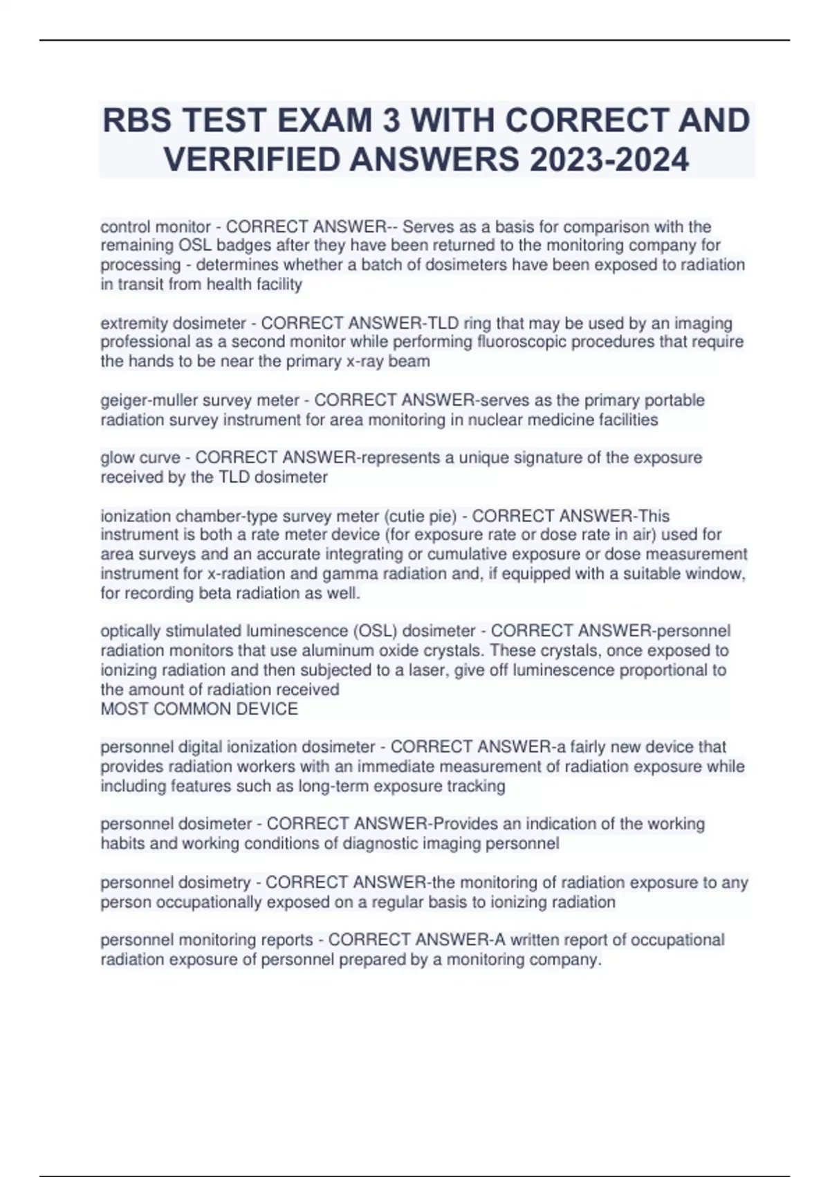RBS TEST EXAM 3 WITH CORRECT AND VERRIFIED ANSWERS control monitor - CORRECT ANSWER-- Serves as a basis for comparison with the remaining OSL badges after they have been returned to the monitoring company for processing - determines whether a batch of dosimeters have been exposed to radiation in transit from health facility extremity dosimeter - CORRECT ANSWER-TLD ring that may be used by an imaging professional as a second monitor while performing fluoroscopic procedures that require the hands to be near the primary x-ray beam geiger-muller survey meter - CORRECT ANSWER-serves as the primary portable radiation survey instrument for area monitoring in nuclear medicine facilities glow curve - CORRECT ANSWER-represents a unique signature of the exposure received by the TLD dosimeter ionization chamber-type survey meter (cutie pie) - CORRECT ANSWER-This instrument is both a rate meter device (for exposure rate or dose rate in air) used for area surveys and an accurate integrating or cumulative exposure or dose measurement instrument for x-radiation and gamma radiation and, if equipped with a suitable window, for recording beta radiation as well. optically stimulated luminescence (OSL) dosimeter - CORRECT ANSWER-personnel radiation monitors that use aluminum oxide crystals. These crystals, once exposed to ionizing radiation and then subjected to a laser, give off luminescence proportional to the amount of radiation received MOST COMMON DEVICE personnel digital ionization dosimeter - CORRECT ANSWER-a fairly new device that provides radiation workers with an immediate measurement of radiation exposure while including features such as long-term exposure tracking personnel dosimeter - CORRECT ANSWER-Provides an indication of the working habits and working conditions of diagnostic imaging personnel personnel dosimetry - CORRECT ANSWER-the monitoring of radiation exposure to any person occupationally exposed on a regular basis to ionizing radiation personnel monitoring reports - CORRECT ANSWER-A written report of occupational radiation exposure of personnel prepared by a monitoring company. pocket ionization chamber (pocket dosimeter) - CORRECT ANSWER-The *most sensitive* type of personnel dosimeter. *Not commonly used in diagnostic imaging*. proportional counter - CORRECT ANSWER-A radiation survey instrument generally used in a laboratory setting to detect alpha and beta radiation and small amounts of other types of low-level radioactive contamination. NO USEFUL PURPOSE IN DIAG. IMAGING radiation survey instruments - CORRECT ANSWER-Area monitoring devices that detect and measure radiation thermoluminescent dosimeter (TLD) - CORRECT ANSWER-A TLD measures ionizing radiation exposure by measuring the intensity of visible light emitted from a crystal in the detector when the crystal is heated. TLD analyzer - CORRECT ANSWER-Measures the amount of ionizing radiation to which a TLD badge has been exposed action limits - CORRECT ANSWER-Limits for occupational exposure that are set by the medical facility well below regulatory values (typically 1/10 of action limit) agreement states - CORRECT ANSWER-Individual states of the U.S. that have entered into an agreement with the NRC to assume responsibility for enforcing radiation protection regulations through health departments ALARA concept - CORRECT ANSWER-Concept of radiation protection that states that all exposures should be kept "as low as reasonably achievable" Annual occupational effective dose limit - CORRECT ANSWER-An upper boundary limit for radiation workers for a yearly whole body exposure of 50 mSv (lifetime EfD in mSv should not exceed 10 x persons age) cumulative effective dose (CumEfD) limit - CORRECT ANSWER-A radiation worker's lifetime EfD must be limited to his or her age in years times 10 mSv. This limit pertains to the whole body. effecting dose (EfD) - CORRECT ANSWER-Quantity used to provide measure of overall risk of exposure to humans from ionizing radiation and takes into account the type of radiation and tissue exposed effective dose (EfD) limiting system - CORRECT ANSWEReffective dose limit (EDL) - CORRECT ANSWERequivalent dose (EqD) - CORRECT ANSWER- International Commission on Radiological Protection (ICRP) - CORRECT ANSWERlifetime effective dose - CORRECT ANSWERNational Council on Radiation protection and measurement (NCRP) - CORRECT ANSWERnegligible individual dose (NID) - CORRECT ANSWERNuclear Regulatory Commission (NRC) - CORRECT ANSWERoptimization - CORRECT ANSWERradiation hormesis - CORRECT ANSWERradiation induced malignancy - CORRECT ANSWERradiation safety committee (RSO) - CORRECT ANSWERstochastic effects - CORRECT ANSWERtissue reactions - CORRECT ANSWERtissue weighting factor (Wt) - CORRECT ANSWERbrightness - CORRECT ANSWER-The amount of luminescence of a display monitor computed radiography (CR) - CORRECT ANSWER-Process in which an image is captured on a removable digital storage cassette using storage phosphorus technology control panel or console - CORRECT ANSWER-Where technical exposure factors, such as milliamperes (mA), peak kilovoltage (kVp), and exposure duration (mS) are selected and visually displayed cumulative timer - CORRECT ANSWER-Used with fluoro units that measures the x-ray beam "on" time and sounds an audible alarm when activated for five minutes Diagnostic-type protective tube housing - CORRECT ANSWER-Required to safeguard the patient and imaging personnel from off focus, or leakage, radiation by restricting the emissions of x-rays to the area of the useful or primary beam digital fluoroscopy (DF) - CORRECT ANSWER-Technique in which fluoroscopic image exists in digital form in the image acquisition pro