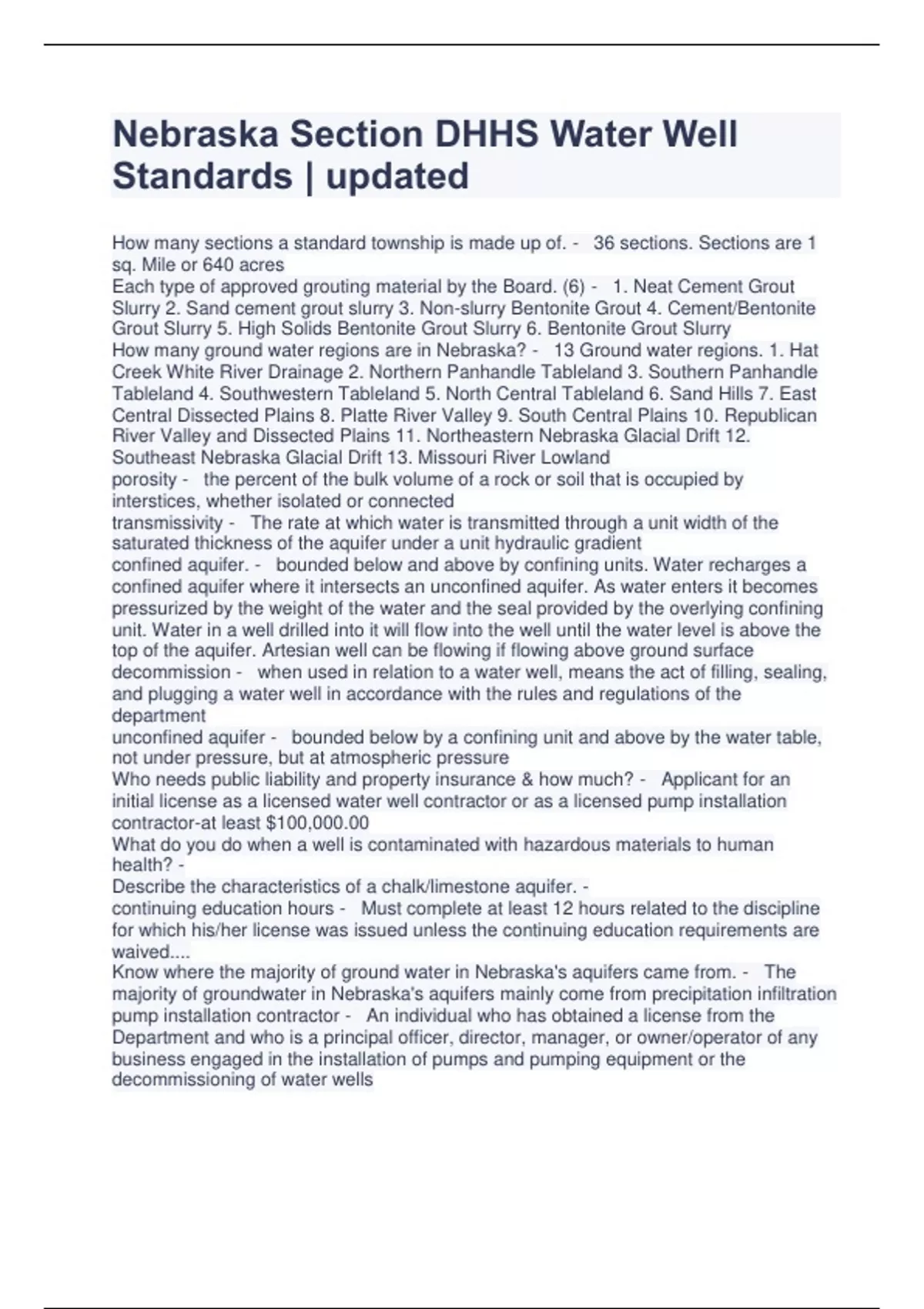 Nebraska Section DHHS Water Well Standards | updated How many sections a standard township is made up of. - 36 sections. Sections are 1 sq. Mile or 640 acres Each type of approved grouting material by the Board. (6) - 1. Neat Cement Grout Slurry 2. Sand cement grout slurry 3. Non-slurry Bentonite Grout 4. Cement/Bentonite Grout Slurry 5. High Solids Bentonite Grout Slurry 6. Bentonite Grout Slurry How many ground water regions are in Nebraska? - 13 Ground water regions. 1. Hat Creek White River Drainage 2. Northern Panhandle Tableland 3. Southern Panhandle Tableland 4. Southwestern Tableland 5. North Central Tableland 6. Sand Hills 7. East Central Dissected Plains 8. Platte River Valley 9. South Central Plains 10. Republican River Valley and Dissected Plains 11. Northeastern Nebraska Glacial Drift 12. Southeast Nebraska Glacial Drift 13. Missouri River Lowland porosity - the percent of the bulk volume of a rock or soil that is occupied by interstices, whether isolated or connected transmissivity - The rate at which water is transmitted through a unit width of the saturated thickness of the aquifer under a unit hydraulic gradient confined aquifer. - bounded below and above by confining units. Water recharges a confined aquifer where it intersects an unconfined aquifer. As water enters it becomes pressurized by the weight of the water and the seal provided by the overlying confining unit. Water in a well drilled into it will flow into the well until the water level is above the top of the aquifer. Artesian well can be flowing if flowing above ground surface
