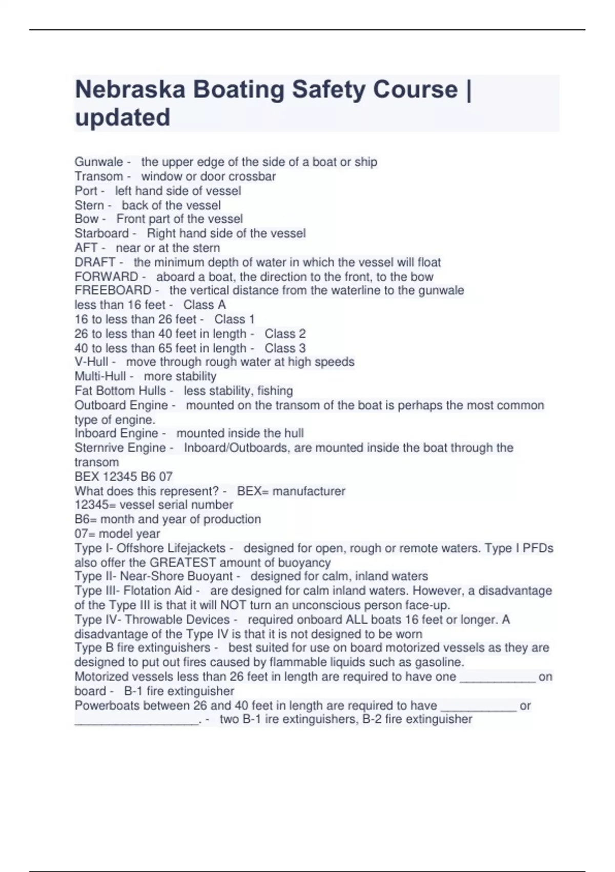 Nebraska Boating Safety Course | updated Gunwale - the upper edge of the side of a boat or ship Transom - window or door crossbar Port - left hand side of vessel Stern - back of the vessel Bow - Front part of the vessel Starboard - Right hand side of the vessel AFT - near or at the stern DRAFT - the minimum depth of water in which the vessel will float FORWARD - aboard a boat, the direction to the front, to the bow FREEBOARD - the vertical distance from the waterline to the gunwale less than 16 feet - Class A 16 to less than 26 feet - Class 1 26 to less than 40 feet in length - Class 2 40 to less than 65 feet in length - Class 3 V-Hull - move through rough water at high speeds Multi-Hull - more stability Fat Bottom Hulls - less stability, fishing Outboard Engine - mounted on the transom of the boat is perhaps the most common type of engine. Inboard Engine - mounted inside the hull Sternrive Engine - Inboard/Outboards, are mounted inside the boat through the transom BEX 12345 B6 07 What does this represent? - BEX= manufacturer 12345= vessel serial number B6= month and year of production 07= model year Type I- Offshore Lifejackets - designed for open, rough or remote waters. Type I PFDs also offer the GREATEST amount of buoyancy Type II- Near-Shore Buoyant - designed for calm, inland waters Type III- Flotation Aid - are designed for calm inland waters. However, a disadvantage of the Type III is that it will NOT turn an unconscious person face-up. Type IV- Throwable Devices - required onboard ALL boats 16 feet or longer. A disadvantage of the Type IV is that it is not designed to be worn Type B fire extinguishers - best suited for use on board motorized vessels as they are designed to put out fires caused by flammable liquids such as gasoline. Motorized vessels less than 26 feet in length are required to have one ___________ on board - B-1 fire extinguisher Powerboats between 26 and 40 feet in length are required to have ___________ or __