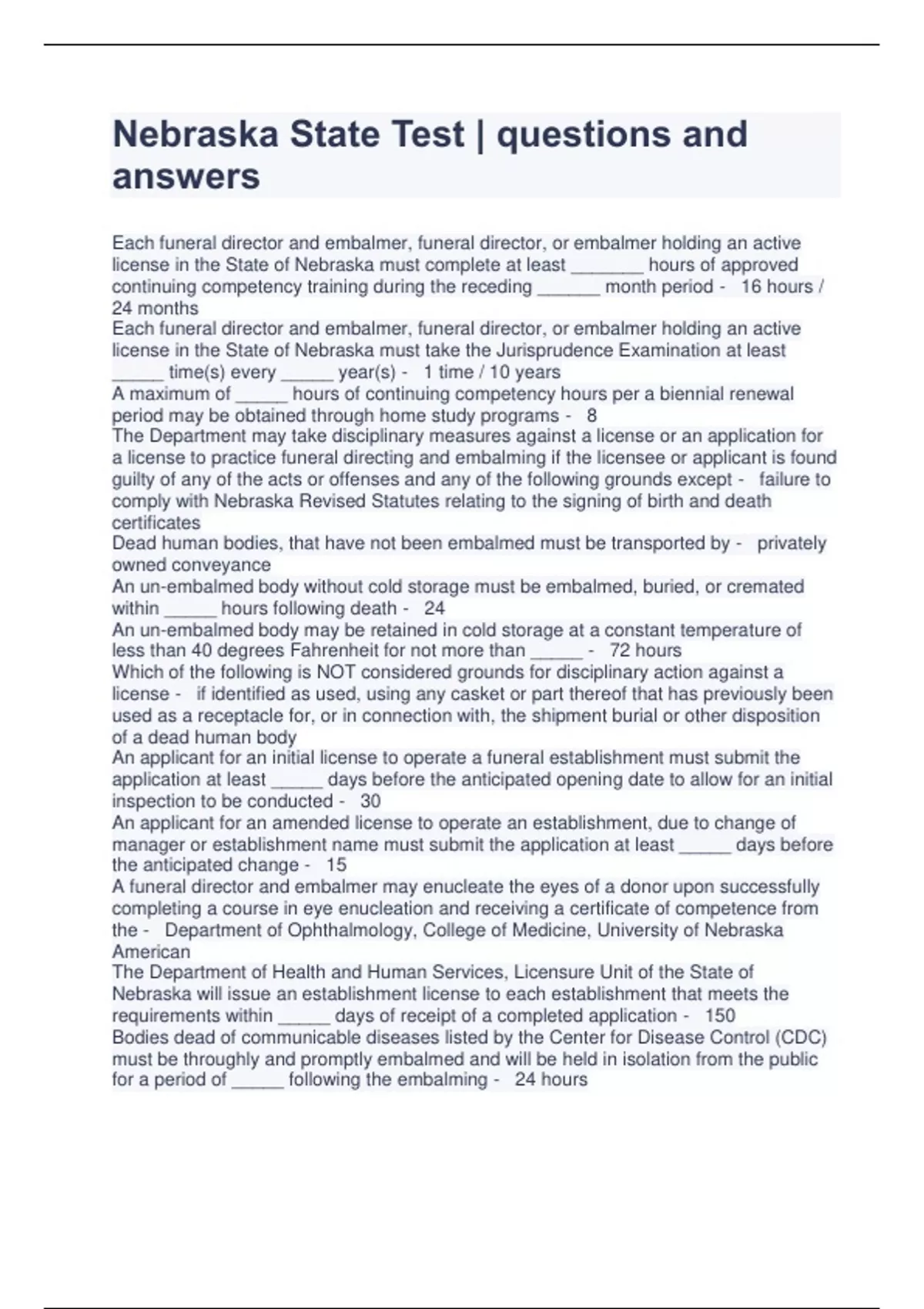 Nebraska State Test | questions and answers Each funeral director and embalmer, funeral director, or embalmer holding an active license in the State of Nebraska must complete at least _______ hours of approved continuing competency training during the receding ______ month period - 16 hours / 24 months Each funeral director and embalmer, funeral director, or embalmer holding an active license in the State of Nebraska must take the Jurisprudence Examination at least _____ time(s) every _____ year(s) - 1 time / 10 years A maximum of _____ hours of continuing competency hours per a biennial renewal period may be obtained through home study programs - 8 The Department may take disciplinary measures against a license or an application for a license to practice funeral directing and embalming if the licensee or applicant is found guilty of any of the acts or offenses and any of the following grounds except - failure to comply with Nebraska Revised Statutes relating to the signing of birth and death certificates Dead human bodies, that have not been embalmed must be transported by - privately owned conveyance An un-embalmed body without cold storage must be embalmed, buried, or cremated within _____ hours following death - 24 An un-embalmed body may be retained in cold storage at a constant temperature of less than 40 degrees Fahrenheit for not more than _____ - 72 hours Which of the following is NOT considered grounds for disciplinary action against a license - if identified as used, using any casket or part thereof that has previously been used as a receptacle for, or in connection with, the shipment burial or other disposition of a dead human body An applicant for an initial license to operate a funeral establishment must submit the application at least _____ days before the anticipated opening date to allow for an initial inspection to be conducted - 30 A
