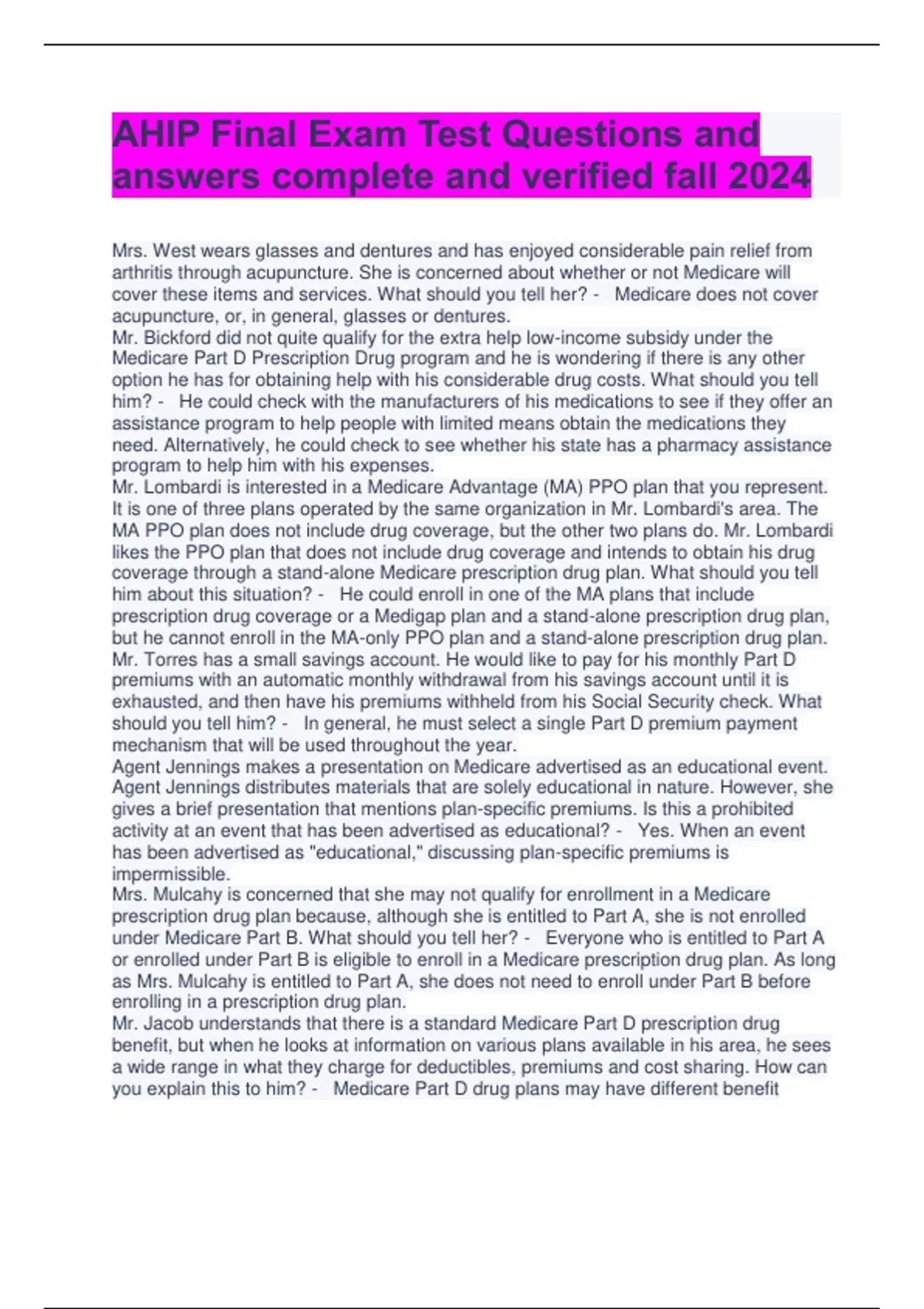 AHIP Final Exam Test Questions and answers complete and verified fall 2024