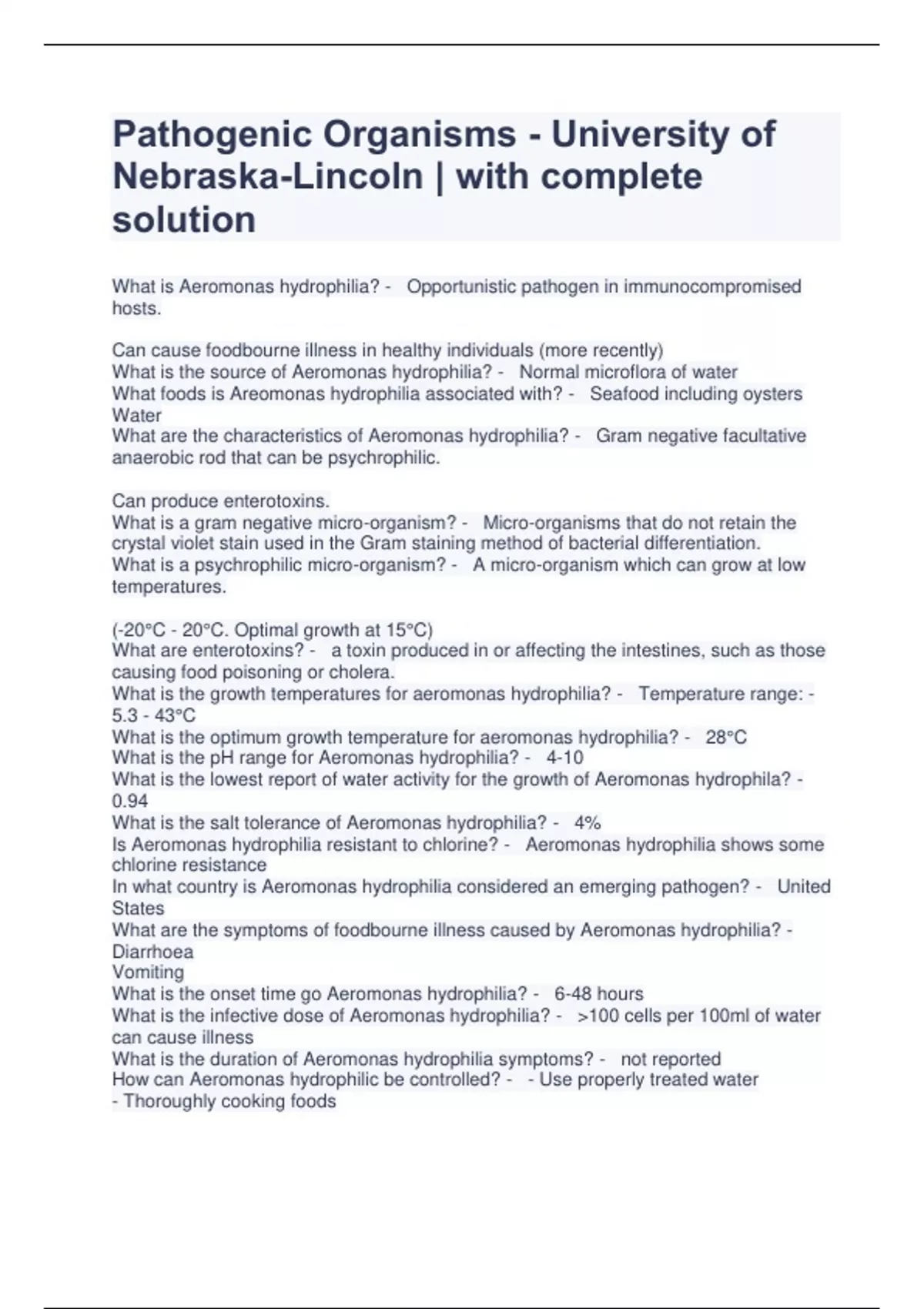 Pathogenic Organisms - University of Nebraska-Lincoln | with complete solution What is Aeromonas hydrophilia? - Opportunistic pathogen in immunocompromised hosts. Can cause foodbourne illness in healthy individuals (more recently) What is the source of Aeromonas hydrophilia? - Normal microflora of water What foods is Areomonas hydrophilia associated with? - Seafood including oysters Water What are the characteristics of Aeromonas hydrophilia? - Gram negative facultative anaerobic rod that can be psychrophilic. Can produce enterotoxins. What is a gram negative micro-organism? - Micro-organisms that do not retain the crystal violet stain used in the Gram staining method of bacterial differentiation. What is a psychrophilic micro-organism? - A micro-organism which can grow at low temperatures. (-20°C - 20°C. Optimal growth at 15°C) What are enterotoxins? - a toxin produced in or affecting the intestines, such as those causing food poisoning or cholera. What is the growth temperatures for aeromonas hydrophilia? - Temperature range: -5.3 - 43°C What is the optimum growth temperature for aeromonas hydrophilia? - 28°C What is the pH range for Aeromonas hydrophilia? - 4-10 What is the lowest report of water activity for the growth of Aeromonas hydrophila? - 0.94 What is the salt tolerance of Aeromonas hydrophilia? - 4% Is Aeromonas hydrophilia resistant to chlorine? - Aeromonas hydrophilia shows some chlorine resistance In what country is Aeromonas hydrophilia considered an emerging pathogen? - United States What are the symptoms of foodbourne illness caused by Aeromonas hydrophilia? - Diarrhoea Vomiting What is the onset time go Aeromonas hydrophilia? - 6-48 hours What is the infective dose of Aeromonas hydrophilia? - >100 cells per 100ml of water can cause illness What is the duration of Aeromonas hydrophilia symptoms? - not reported How can Aeromonas hydrophilic be controlled? - - Use properly treated water - Thoroughly cooking foods - Handle and store extended shelf life refrigerated foods properly due to the psychrophilic nature of Aeromonas hydrophilia Is Aeromonas hydrophilia a bacteria, a virus or a parasite? - A bacteria Is Bacillus cereus a bacteria, virus or parasite? - A bacteria. What is Bacillus cereus? - A facultative anaerobic spore forming bacteria. Widespread in nature and foods, especially in its spore state. What are the sources of Bacillus cereus? - Soil Unpasteurised milk Cereals and starch Herbs and Spices What foods are associated with Bacillus cereus? - Meat pies Cooked and fired rice Starchy foods (potatoes and pasta) Food mixtures (soups, casseroles and sauces) Puddings What are the characteristics of Bacillus cereus? - Gram positive facultative anaerobic spore forming rod. What is the temperature range for growth of Bacillus cereus? - 10-49°C What is the optimum temperature for growth of Bacillus cereus? - 30°C What is the pH range for growth of Bacillus cereus? - 4.9-9.3 What is the lowest reported water activity for Bacillus cereus? - 0.93 What are the 2 types of illness caused from Bacillus cereus? - Diarrheal illness Emetic (vomiting) illness What are the symptoms of Bacillus cereus? - Abdominal cramps Watery diarrhoea nausea Vomiting What is the onset time for Bacillus cereus? - Diarrhoeal: 10-16 hours Emetic.: 1-6 hours What is the infective dose for Bacillus cereus? - Large numbers (more than 10 to the 5 CFU/gm) How long to bacillus cereus symptoms usually last? - 1 day How can Bacillus cereus be controlled? - - thoroughly cooked ground meat products - cool cooked products to 5°C within 4 hours - Hold hot food at or above 60°C Is Hepatits A a bacteria, virus or parasite? - Virus What is Hepatitis A? - An ultramicroscopic organism that must have a living host to multiply. Food can transmit the virus between people. The virus, when transferred to food, can survive for several days, even whilst refrigerated.