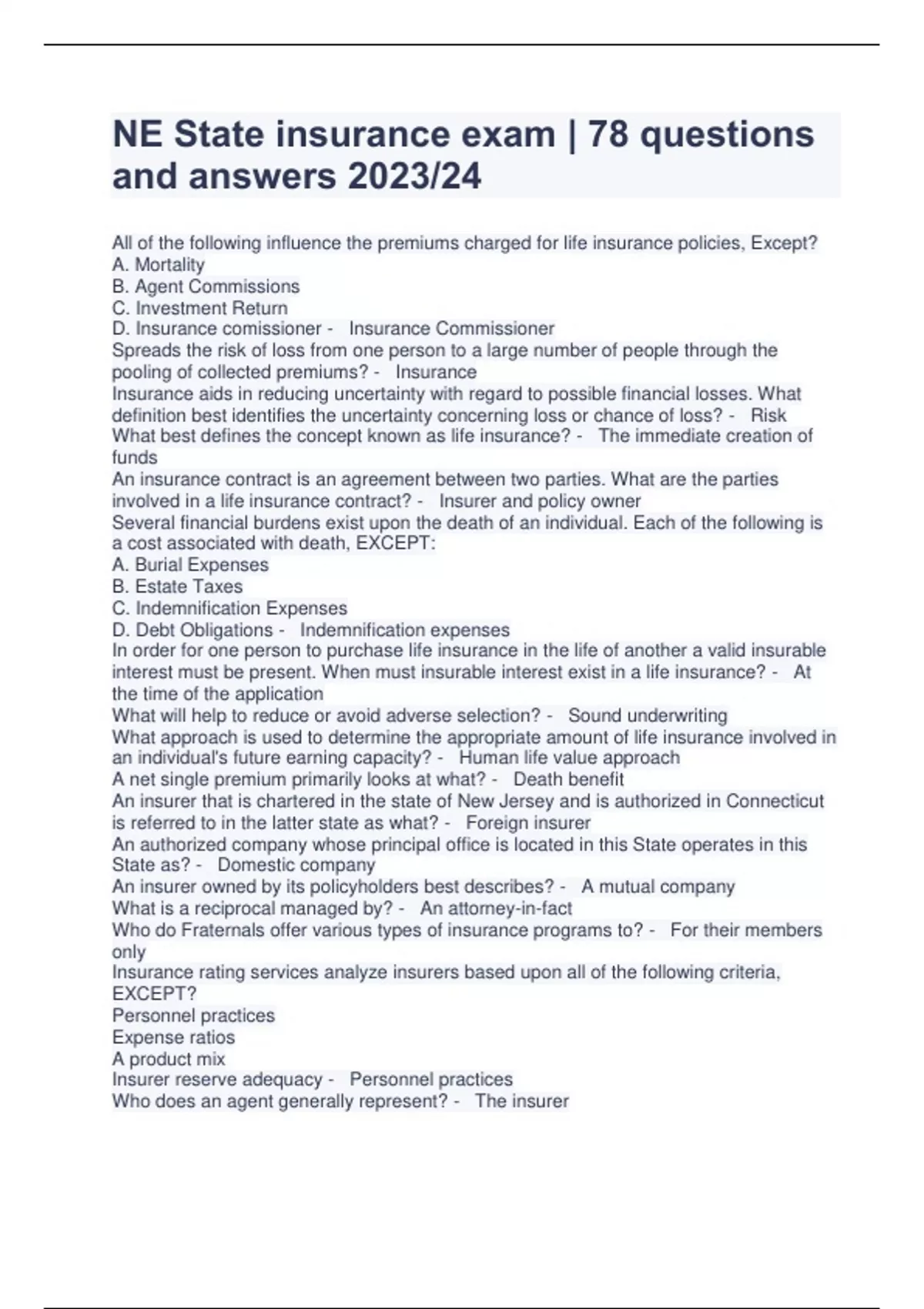 NE State insurance exam | 78 questions and answers 2023/24 All of the following influence the premiums charged for life insurance policies, Except? A. Mortality B. Agent Commissions C. Investment Return D. Insurance comissioner - Insurance Commissioner Spreads the risk of loss from one person to a large number of people through the pooling of collected premiums? - Insurance Insurance aids in reducing uncertainty with regard to possible financial losses. What definition best identifies the uncertainty concerning loss or chance of loss? - Risk What best defines the concept known as life insurance? - The immediate creation of funds An insurance contract is an agreement between two parties. What are the parties involved in a life insurance contract? - Insurer and policy owner Several financial burdens exist upon the death of an individual. Each of the following is a cost associated with death, EXCEPT: A. Burial Expenses B. Estate Taxes C. Indemnification Expenses D. Debt Obligations - Indemnification expenses In order for one person to purchase life insurance in the life of another a valid insurable interest must be present. When must insurable interest exist in a life insurance? - At the time of the application What will help to reduce or avoid adverse selection? - Sound underwriting What approach is used to determine the appropriate amount of life insurance involved in an individual's future earning capacity? - Human life value approach A net single premium primarily looks at what? - Death benefit An insurer that is chartered in the state of New Jersey and is authorized in Connecticut is referred to in the latter state as what? - Foreign insurer An authorized company whose principal office is located in this State operates in this State as? - Domestic company A