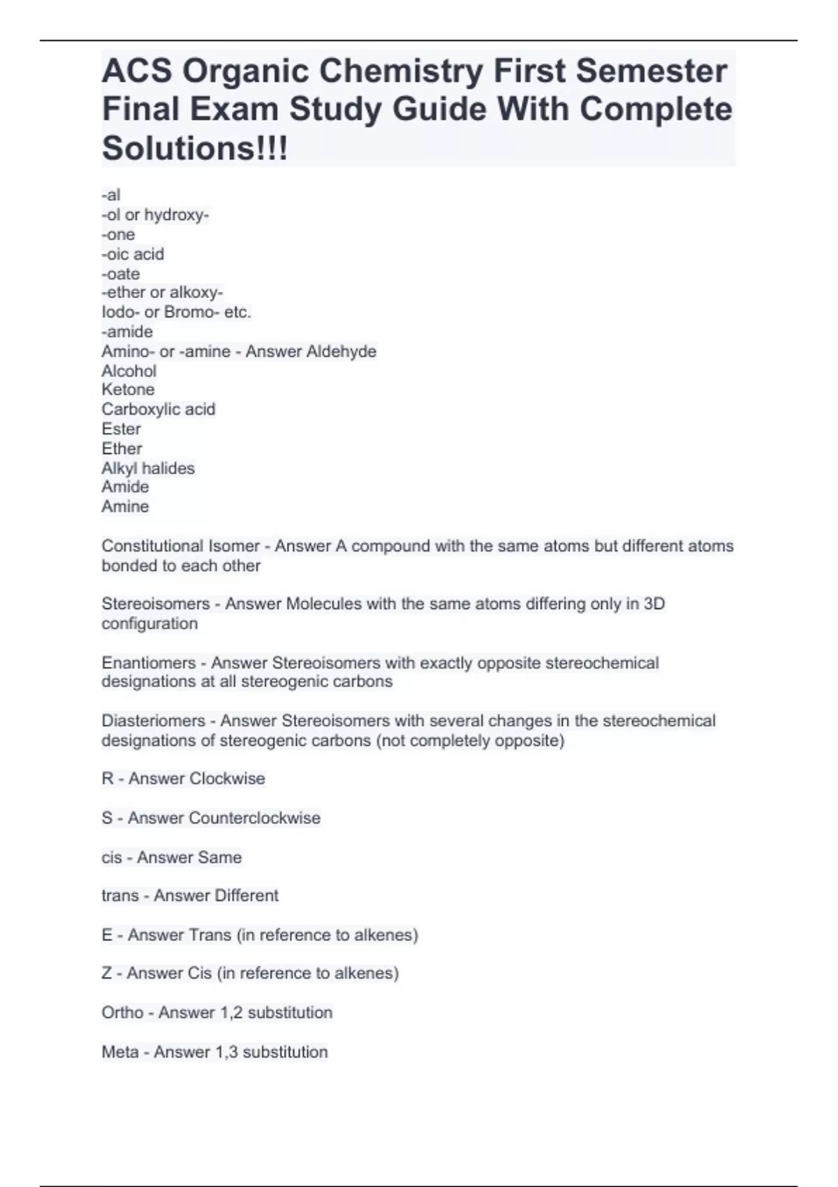 ACS Organic Chemistry First Semester Final Exam Study Guide With Complete Solutions!!!