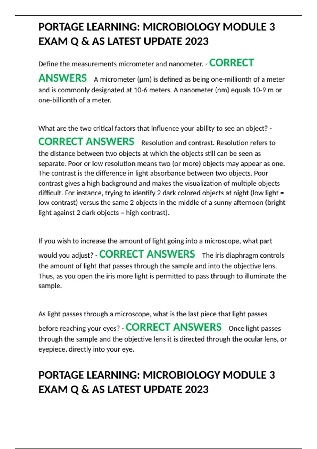 PORTAGE LEARNING: MICROBIOLOGY MODULE 3 EXAM Q & AS LATEST UPDATE 2023