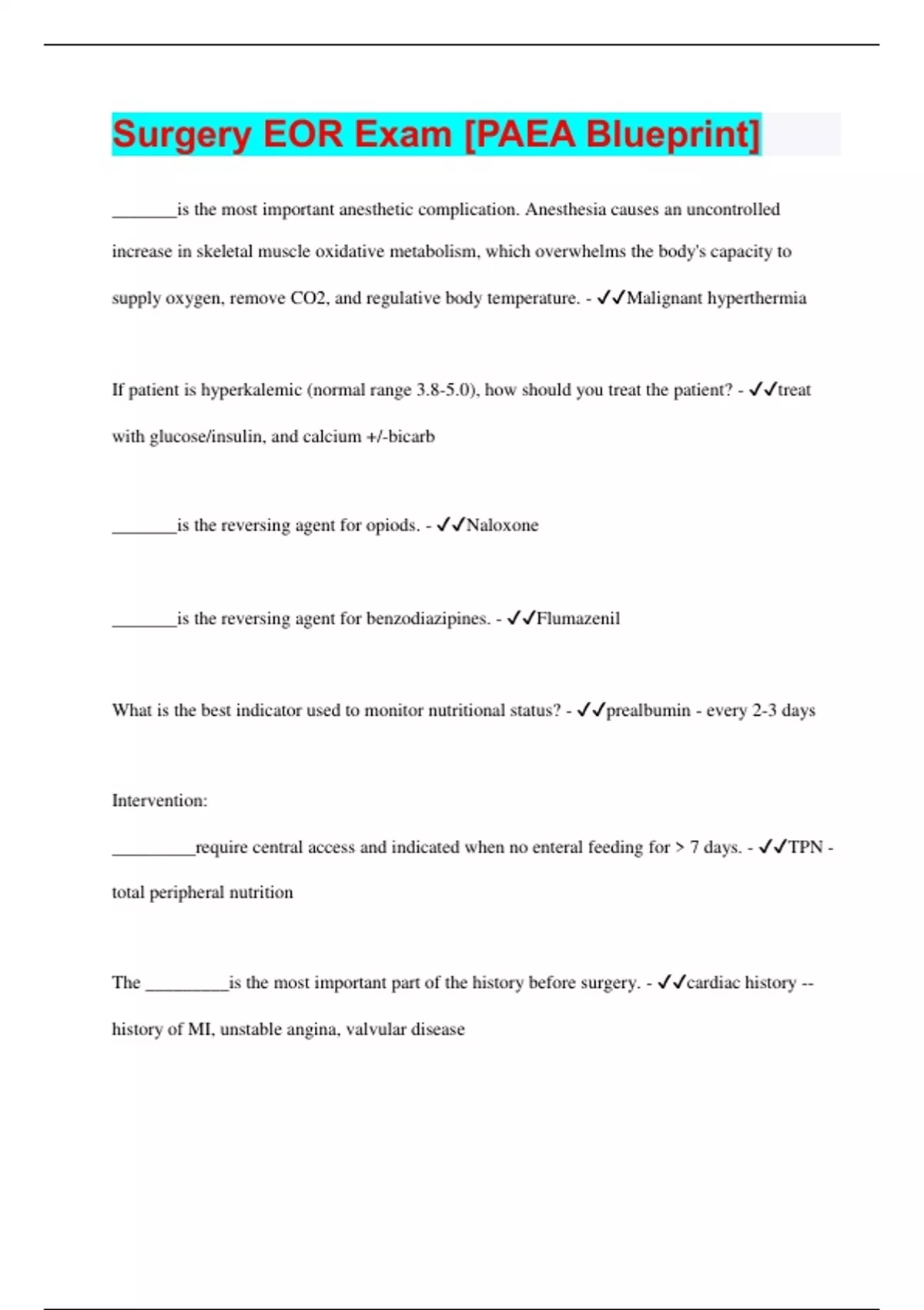 Surgery EOR Exam [PAEA Blueprint] | Questions with 100% Correct Answers | Latest Update 2024 | Verified