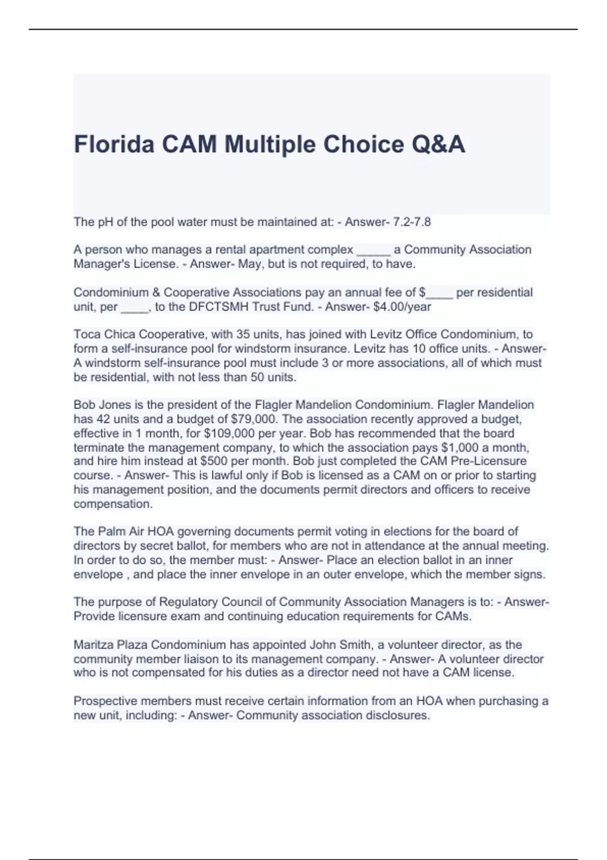 Florida CAM/Gold Coast CAM Exams Bundle (Graded A)