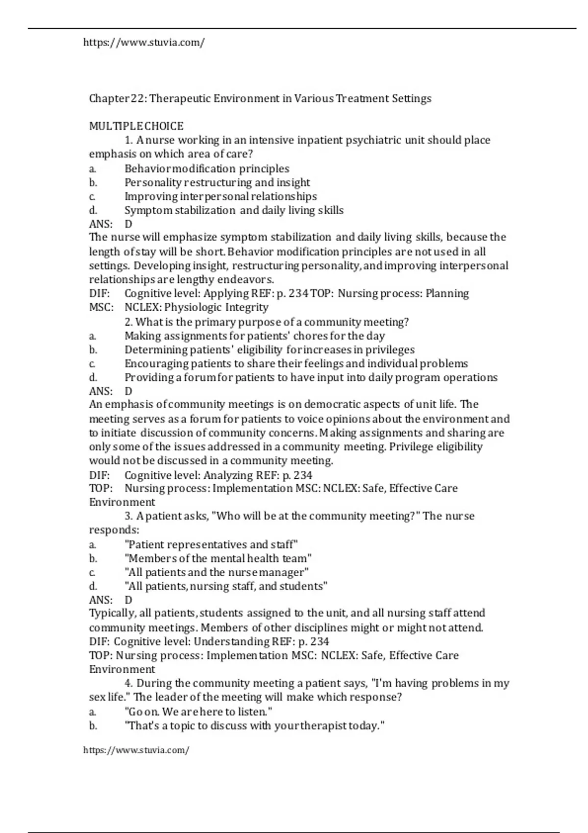 Test Bank For Keltner’s Psychiatric Nursing, 9th Edition By Debbie Steele Chapter 22 Therapeutic Environment in Various Treatment Settings