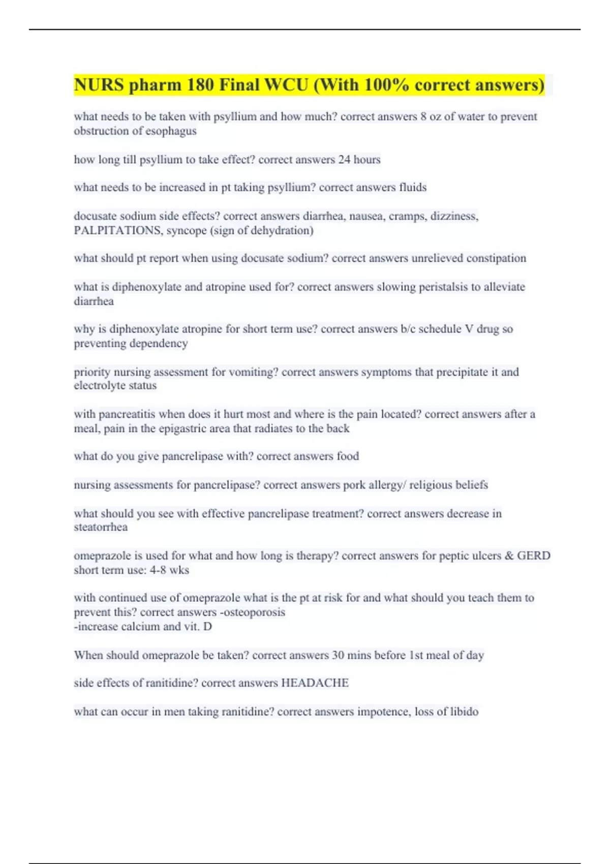 what needs to be taken with psyllium and how much? correct answers 8 oz of water to prevent obstruction of esophagus how long till psyllium to take effect? correct answers 24 hours what needs to be increased in pt taking psyllium? correct answers fluids docusate sodium side effects? correct answers diarrhea, nausea, cramps, dizziness, PALPITATIONS, syncope (sign of dehydration) what should pt report when using docusate sodium? correct answers unrelieved constipation what is diphenoxylate and atropine used for? correct answers slowing peristalsis to alleviate diarrhea why is diphenoxylate atropine for short term use? correct answers b/c schedule V drug so preventing dependency priority nursing assessment for vomiting? correct answers symptoms that precipitate it and electrolyte status with pancreatitis when does it hurt most and where is the pain located? correct answers after a meal, pain in the epigastric area that radiates to the back what do you give pancrelipase with? correct answers food nursing assessments for pancrelipase? correct answers pork allergy/ religious beliefs what should you see with effective pancrelipase treatment? correct answers decrease in steatorrhea omeprazole is used for what and how long is therapy? correct answers for peptic ulcers & GERD short term use: 4-8 wks with continued use of omeprazole what is the pt at risk for and what should you teach them to prevent this? correct answers -osteoporosis -increase calcium and vit. D When should omeprazole be taken? correct answers 30 mins before 1st meal of day side effects of ranitidine? correct answers HEADACHE what can occur in men taking ranitidine? correct answers impotence, loss of libido