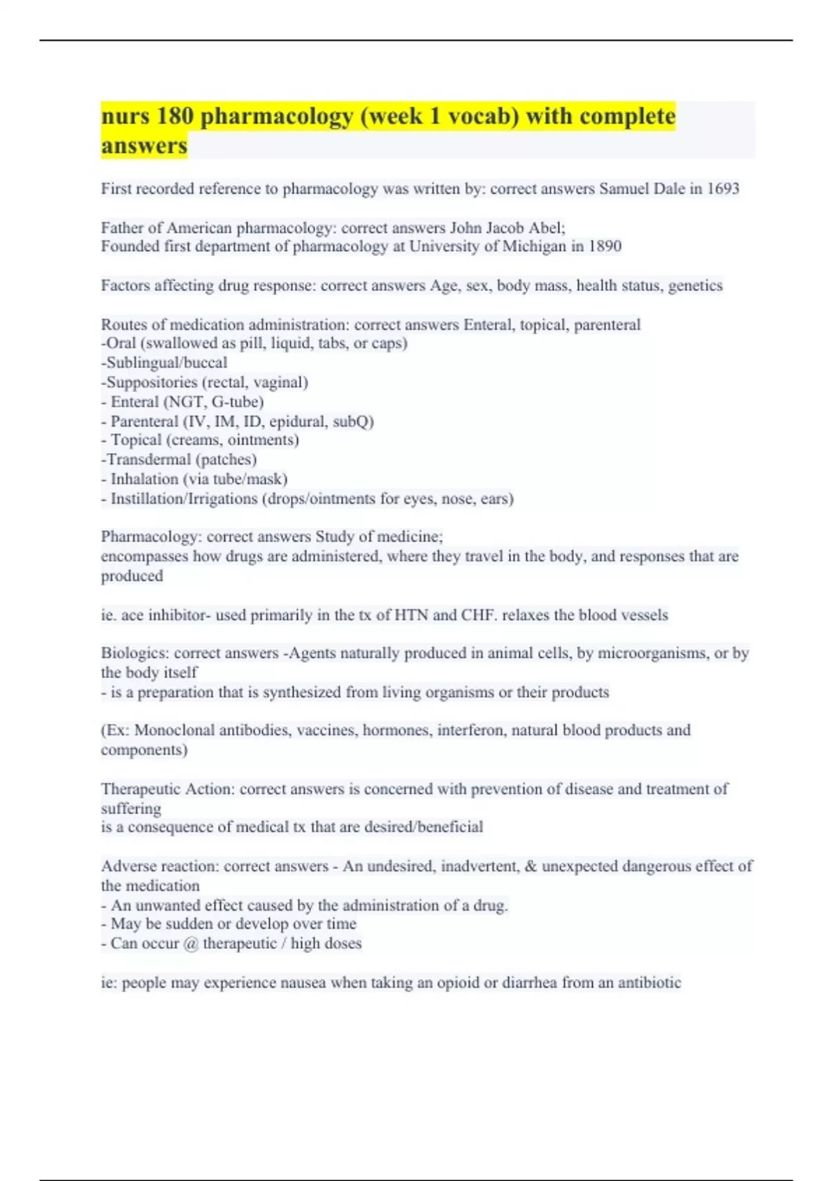 First recorded reference to pharmacology was written by: correct answers Samuel Dale in 1693 Father of American pharmacology: correct answers John Jacob Abel; Founded first department of pharmacology at University of Michigan in 1890 Factors affecting drug response: correct answers Age, sex, body mass, health status, genetics Routes of medication administration: correct answers Enteral, topical, parenteral -Oral (swallowed as pill, liquid, tabs, or caps) -Sublingual/buccal -Suppositories (rectal, vaginal) - Enteral (NGT, G-tube) - Parenteral (IV, IM, ID, epidural, subQ) - Topical (creams, ointments) -Transdermal (patches) - Inhalation (via tube/mask) - Instillation/Irrigations (drops/ointments for eyes, nose, ears) Pharmacology: correct answers Study of medicine; encompasses how drugs are administered, where they travel in the body, and responses that are produced ie. ace inhibitor- used primarily in the tx of HTN and CHF. relaxes the blood vessels Biologics: correct answers -Agents naturally produced in animal cells, by microorganisms, or by the body itself - is a preparation that is synthesized from living organisms or their products (Ex: Monoclonal antibodies, vaccines, hormones, interferon, natural blood products and components) Therapeutic Action: correct answers is concerned with prevention of disease and treatment of suffering is a consequence of medical tx that are desired/beneficial Adverse reaction: correct answers - An undesired, inadvertent, & unexpected dangerous effect of the medication - An unwanted effect caused by the administration of a drug. - May be sudden or develop over time - Can occur @ therapeutic / high doses ie: people may experience nausea when taking an opioid or diarrhea from an antibiotic