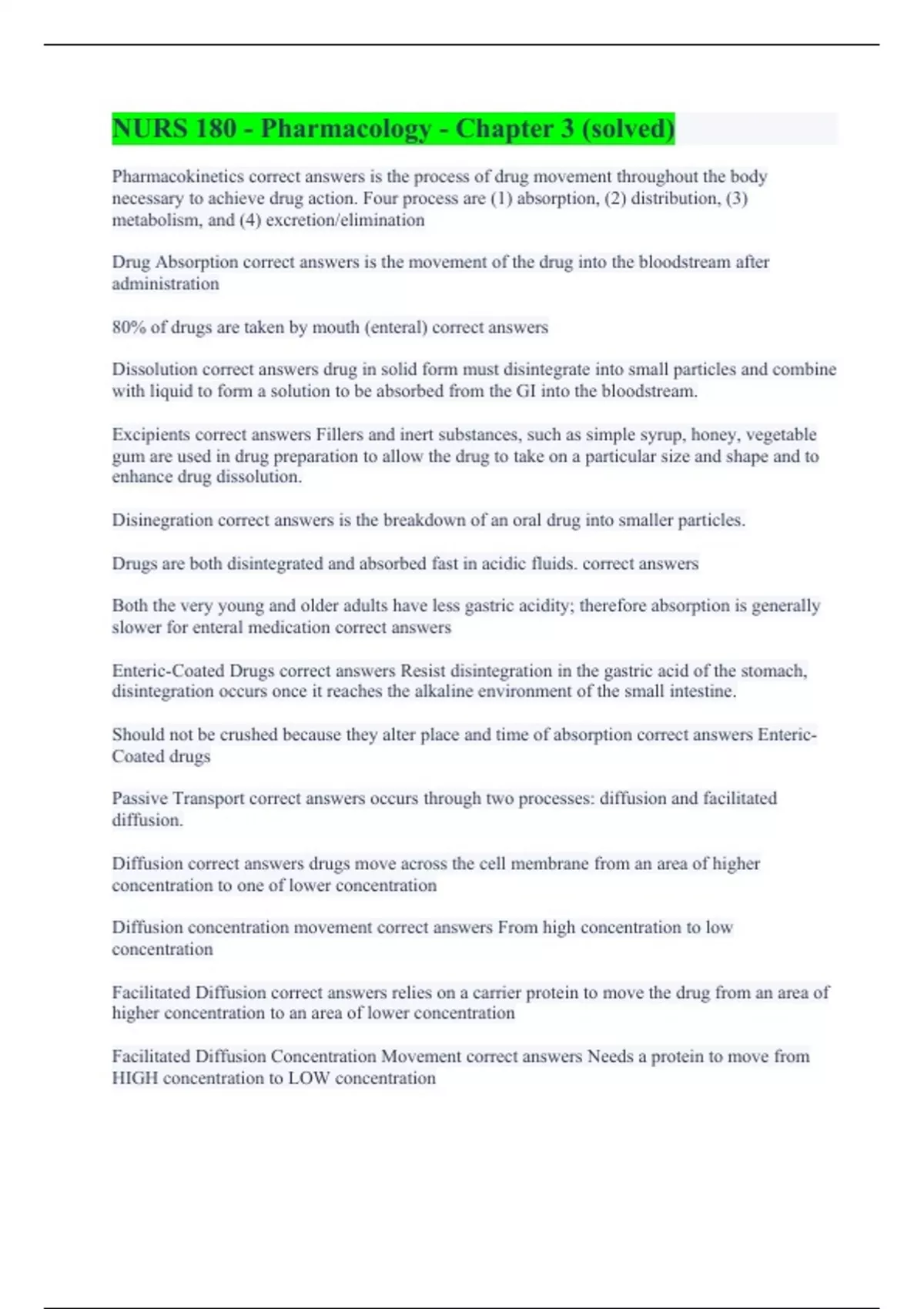 Pharmacokinetics correct answers is the process of drug movement throughout the body necessary to achieve drug action. Four process are (1) absorption, (2) distribution, (3) metabolism, and (4) excretion/elimination Drug Absorption correct answers is the movement of the drug into the bloodstream after administration 80% of drugs are taken by mouth (enteral) correct answers Dissolution correct answers drug in solid form must disintegrate into small particles and combine with liquid to form a solution to be absorbed from the GI into the bloodstream. Excipients correct answers Fillers and inert substances, such as simple syrup, honey, vegetable gum are used in drug preparation to allow the drug to take on a particular size and shape and to enhance drug dissolution. Disinegration correct answers is the breakdown of an oral drug into smaller particles. Drugs are both disintegrated and absorbed fast in acidic fluids. correct answers Both the very young and older adults have less gastric acidity; therefore absorption is generally slower for enteral medication correct answers Enteric-Coated Drugs correct answers Resist disintegration in the gastric acid of the stomach, disintegration occurs once it reaches the alkaline environment of the small intestine. Should not be crushed because they alter place and time of absorption correct answers Enteric-Coated drugs Passive Transport correct answers occurs through two processes: diffusion and facilitated diffusion. Diffusion correct answers drugs move across the cell membrane from an area of higher concentration to one of lower concentration Diffusion concentration movement correct answers From high concentration to low concentration Facilitated Diffusion correct answers relies on a carrier protein to move the drug from an area of higher concentration to an area of lower concentration Facilitated Diffusion Concentration Movement correct answers Needs a protein to move from HIGH concentration to LOW concentration