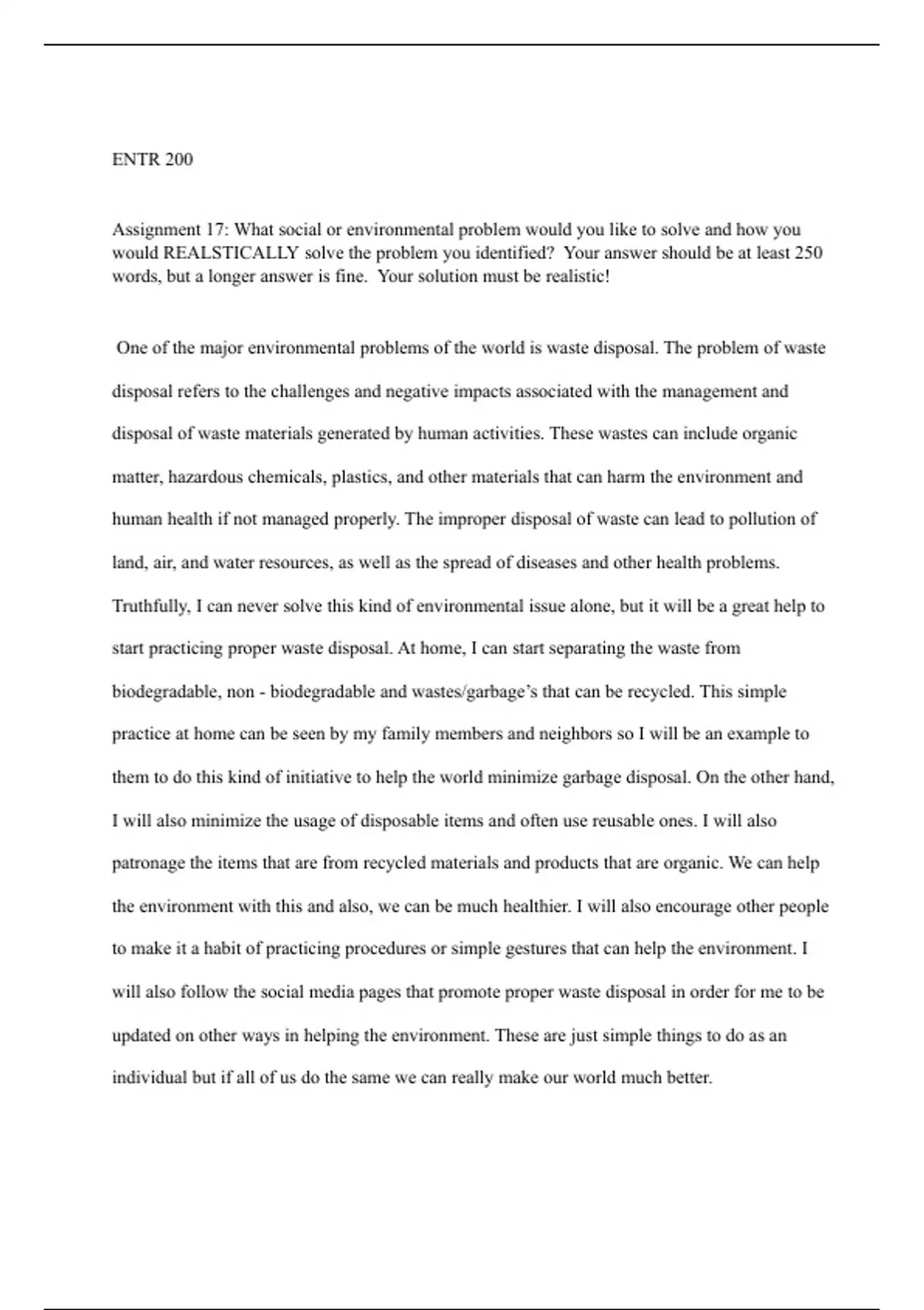 What social or environmental problem would you like to solve and how you would REALSTICALLY solve the problem you identified?