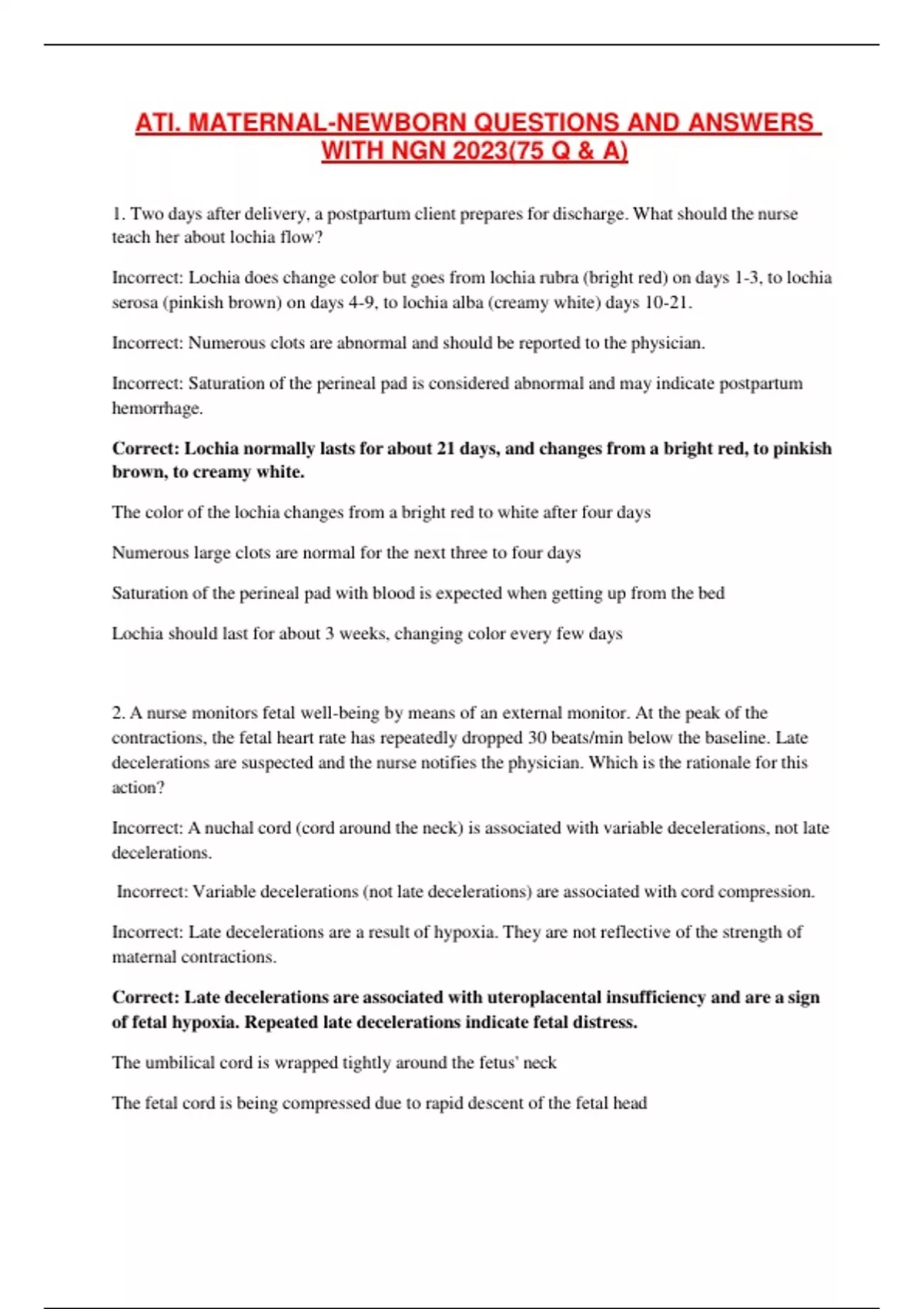 ATI. MATERNAL-NEWBORN QUESTIONS AND ANSWERS WITH NGN 2023(75 Q & A) 1. Two days after delivery, a postpartum client prepares for discharge. What should the nurse teach her about lochia flow? Incorrect: Lochia does change color but goes from lochia rubra (bright red) on days 1-3, to lochia serosa (pinkish brown) on days 4-9, to lochia alba (creamy white) days 10-21. Incorrect: Numerous clots are abnormal and should be reported to the physician. Incorrect: Saturation of the perineal pad is considered abnormal and may indicate postpartum hemorrhage. Correct: Lochia normally lasts for about 21 days, and changes from a bright red, to pinkish brown, to creamy white. The color of the lochia changes from a bright red to white after four days Numerous large clots are normal for the next three to four days Saturation of the perineal pad with blood is expected when getting up from the bed Lochia should last for about 3 weeks, changing color every few days
