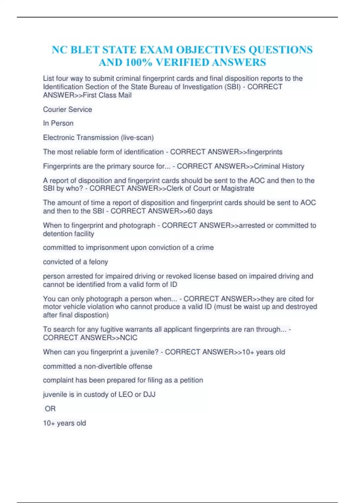 NC BLET STATE EXAM OBJECTIVES QUESTIONS AND 100% VERIFIED ANSWERS.