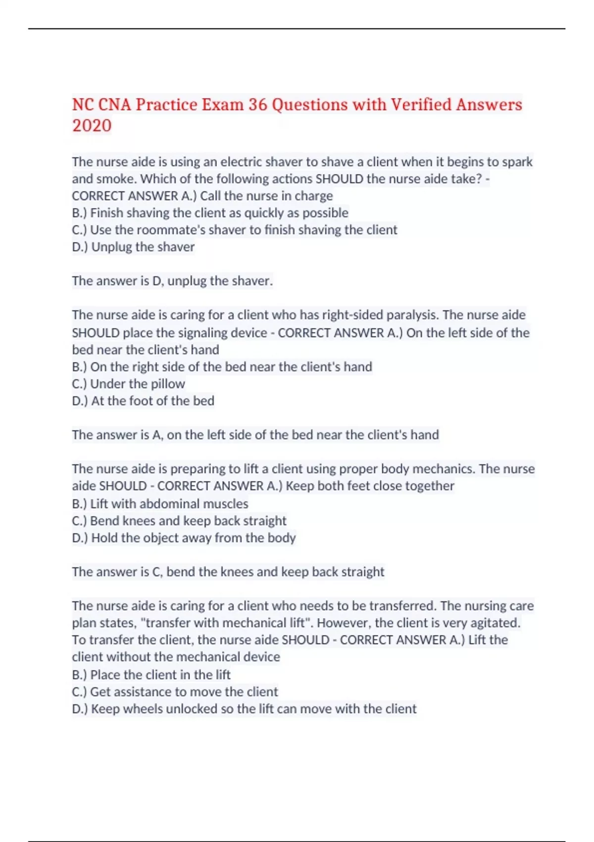 NC CNA Practice Exam 36 Questions with Verified Answers 2020 The nurse aide is using an electric shaver to shave a client when it begins to spark and smoke. Which of the following actions SHOULD the nurse aide take? - CORRECT ANSWER A.) Call the nurse in charge B.) Finish shaving the client as quickly as possible C.) Use the roommate's shaver to finish shaving the client D.) Unplug the shaver The answer is D, unplug the shaver. The nurse aide is caring for a client who has right-sided paralysis. The nurse aide SHOULD place the signaling device - CORRECT ANSWER A.) On the left side of the bed near the client's hand B.) On the right side of the bed near the client's hand C.) Under the pillow D.) At the foot of the bed The answer is A, on the left side of the bed near the client's hand The nurse aide is preparing to lift a client using proper body mechanics. The nurse aide SHOULD - CORRECT ANSWER A.) Keep both feet close together B.) Lift with abdominal muscles C.) Bend knees and keep back straight D.) Hold the object away from the body The answer is C, bend the knees and keep back straight The nurse aide is caring for a client who needs to be transferred. The nursing care plan states, "transfer with mechanical lift". However, the client is very agitated. To transfer the client, the nurse aide SHOULD - CORRECT ANSWER A.) Lift the client without the mechanical device B.) Place the client in the lift C.) Get assistance to move the client D.) Keep wheels unlocked so the lift can move with the client The answer is C, get assistance to move the client The nurse aide is assisting a client with eating. The client begins to choke and turn blue. The nurse aide SHOULD - CORRECT ANSWER A.) Immediately remove the client's food tray and go find the nurse in charge B.) Slap the client on the back until the food dislodges C.) Call for assistance and perform the Heimlich maneuver (abdominal thrust) D.) Give the client a drink of water The answer is C, call for assistance and perform the Heimlich maneuver (abdominal thrust) The nurse aide is providing evening care for a client with a full set of dentures. Proper procedure requires that the dentures be placed: - CORRECT ANSWER A.) In the client's bathroom on the sink B.) In tissue on the bedside stand C.) Under the client's pillow D.) In a denture cup with the client's name on it The answer is D, in a denture cup with the client's name on it What type of fire can be put out with water? - CORRECT ANSWER A.) Electrical B.) Grease C.) Paper D.) Chemical The answer is C, paper The nurse aide is responsible for all of the following fire prevention measures EXCEPT - CORRECT ANSWER A.) Taking cigarettes and matches away from all clients and visitors B.) Being aware of the locations of fire extinguishers C.) Reporting all damaged wiring and/or sockets in clients' room D.) Participating in fire drills The answer is A, taking cigarettes and matches away from all clients and visitors The nurse aide is preparing to help a client walk from the the bed to a chair. Which of the following SHOULD the nurse aide put on the client's feet? - CORRECT ANSWER A.) Socks or stockings only B.) Cloth-soled slippers C.) Rubber-soled slippers or shoes D.) Nothing The answer is C, rubber-soled slippers or shoes The nurse aide understands that the MOST important reason for using soap and water to clean the client's skin after elimination is to: - CORRECT ANSWER A.) Keep the client happy B.) Prevent soiling of bed linen C.) Remove feces and urine from the skin D.) Keep the linen costs down The answer is C, remove feces and urine from the skin The nurse aide SHOULD refuse to perform a task if the: - CORRECT ANSWER A.) Nurse aide has not been trained to do it B.) Client is difficult to deal with C.) Nurse aide can find someone else to do it D.) Nurse aide is at the end of the shift The answer is A, nurse aide has not been trained to do it Before helping a client into a bath or shower, the nurse aide should FIRST: - CORRECT ANSWER A.) Check the temperature of the water B.) Shampoo the client's hair C.) Soak the client's feet D.) Apply lotion or oil to the client's skin The answer is A, check the temperature of the water When taking a client's radial pulse, the nurse aide's fingertips should be placed on the client's - CORRECT ANSWER A.) Chest B.) Wrist C.) Neck D.) Elbow The answer is B, wrist The nurse aide reports directly to the: - CORRECT ANSWER A.) Nurse supervisor B.) Physician C.) Staff development nurse D.) Administrator The answer is A, nurse supervisor When communicating with the client's family, the nurse aide SHOULD: - CORRECT ANSWER A.) Listen to concerns and offer support B.) Offer advice about the client's medical treatment C.) Get involved in family problems D.) Share the latest facility gossip The answer is A, listen to concerns and offer support The nurse aide is making an empty bed and notices that the side rail is broken. The nurse aide SHOULD - CORRECT ANSWER A.) Wait for the next safety check to report the broken side rail B.) Report the broken side rail immediately C.) Tie the side rail in the raised position until it is fixed D.) Warn the client to be careful when getting back into bed The answer is B, report the broken side rail immediately The nurse aide is caring for a client who becomes incontinent of urine right before dinner. The nurse aide SHOULD - CORRECT ANSWER A.) Take the client to the dinner table and clean up after dinner B.) Clean the client and take to dinner as soon as possible C.) Tell the client not to eat until the client has cleaned and changed self D.) Insist that the client eat dinner in the room The answer is B, clean the client and take to dinner as soon as possible The nurse aide notices that the client's radio cord is draped across a chair in order to reach the nearest outlet. The FIRST thing the nurse aide should do - CORRECT ANSWER A.) Tell the client the radio is a safety hazard and take it away B.) Unplug the radio and ask the client not t