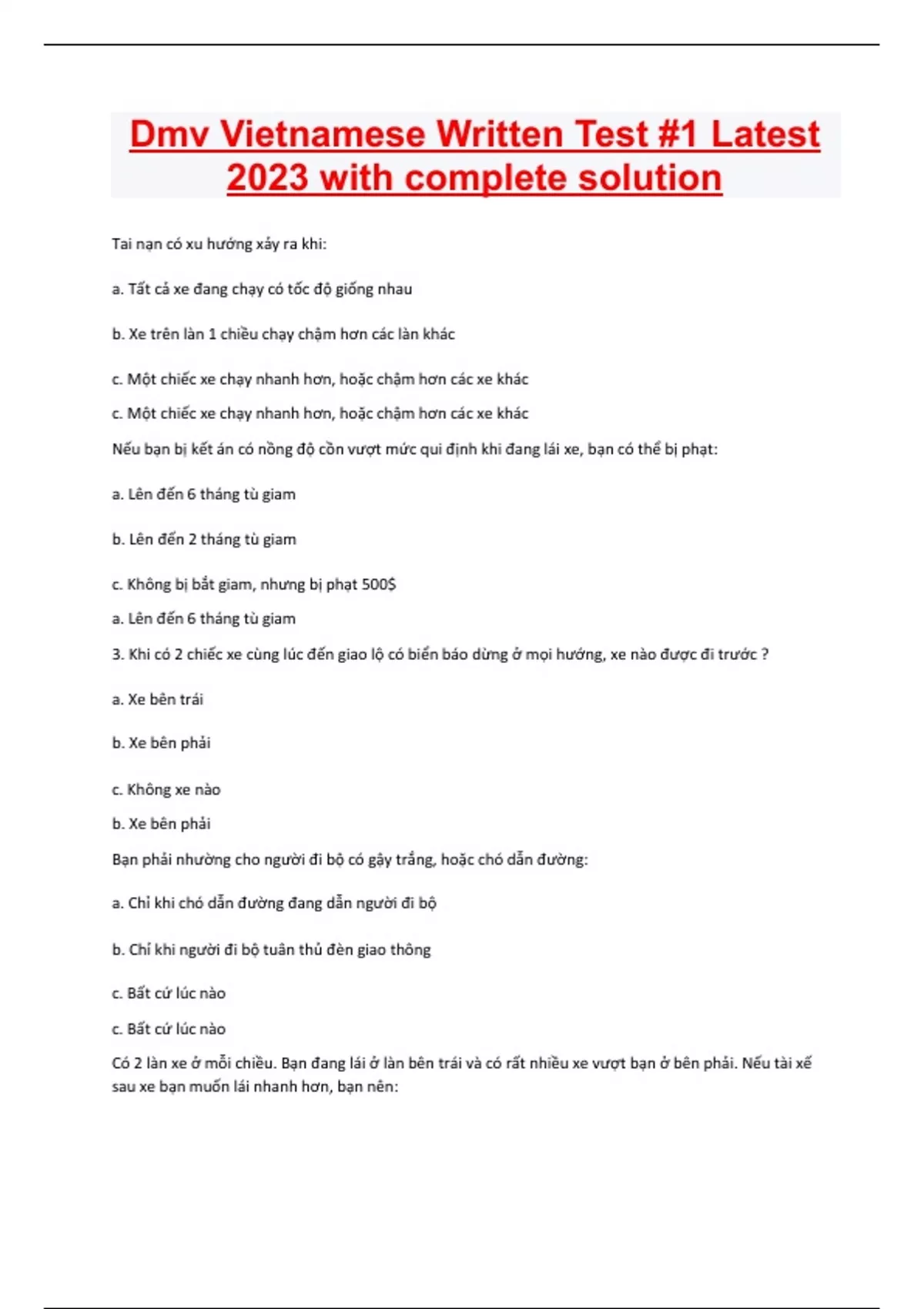 Dmv Vietnamese Written Test #1 Latest 2023 with complete solution Tai nạn có xu hướng xảy ra khi: a. Tất cả xe đang chạy có tốc độ giống nhau b. Xe trên làn 1 chiều chạy chậm hơn các làn khác c. Một chiếc xe chạy nhanh hơn, hoặc chậm hơn các xe khác c. Một chiếc xe chạy nhanh hơn, hoặc chậm hơn các xe khác Nếu bạn bị kết án có nồng độ cồn vượt mức qui định khi đang lái xe, bạn có thể bị phạt