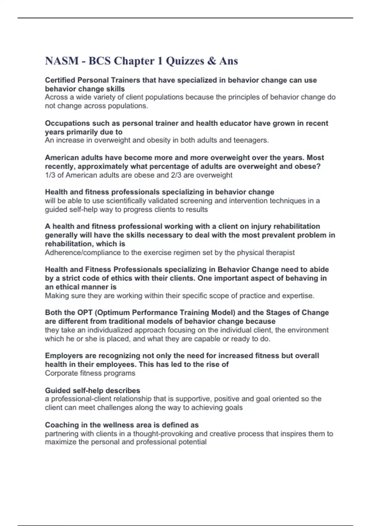NASM - BCS Chapter 1 Quizzes & Ans Certified Personal Trainers that have specialized in behavior change can use behavior change skills Across a wide variety of client populations because the principles of behavior change do not change across populations. Occupations such as personal trainer and health educator have grown in recent years primarily due to An increase in overweight and obesity in both adults and teenagers. American adults have become more and more overweight over the years. Most recently, approximately what percentage of adults are overweight and obese? 1/3 of American adults are obese and 2/3 are overweight