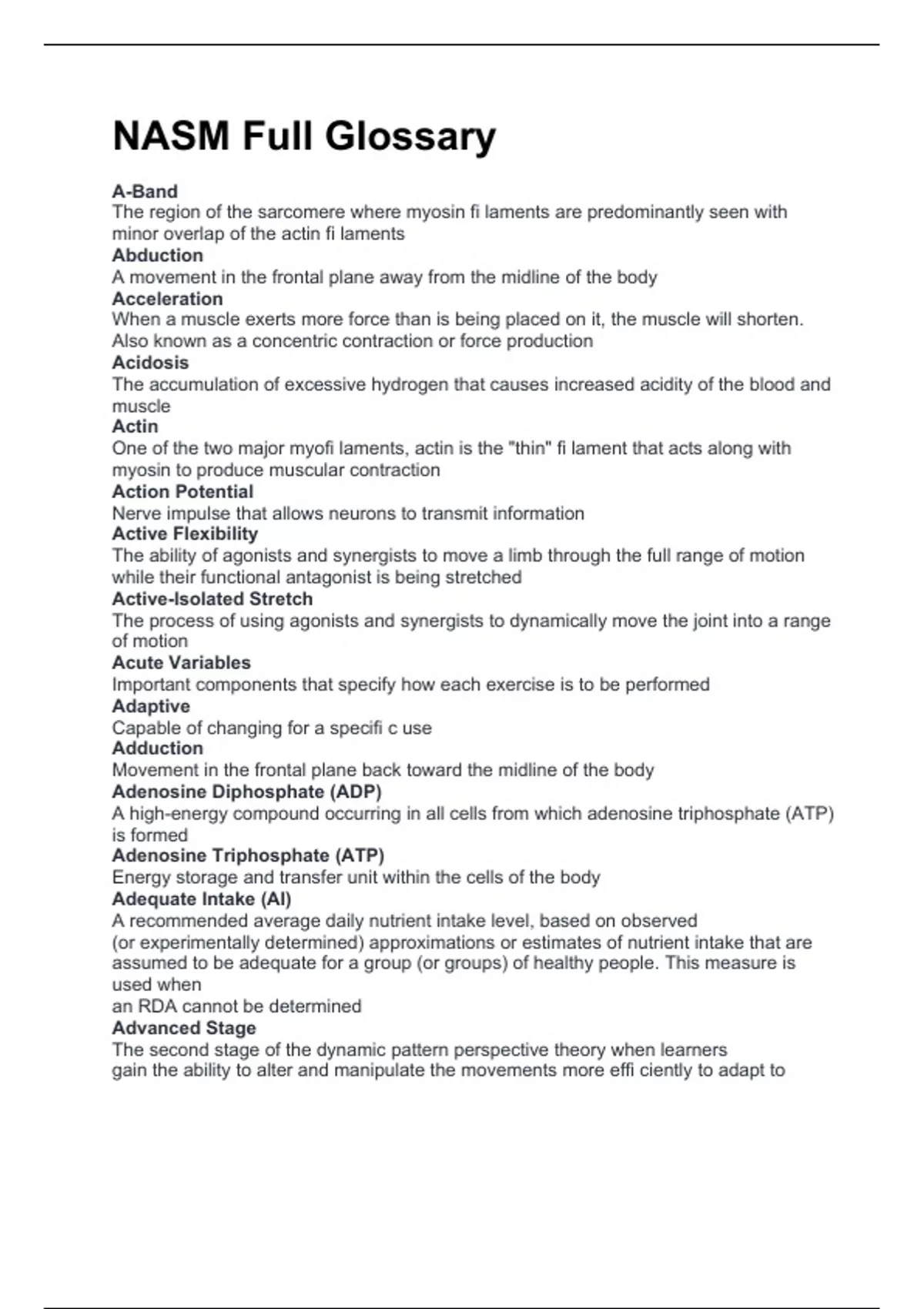 NASM Full Glossary A-Band The region of the sarcomere where myosin fi laments are predominantly seen with minor overlap of the actin fi laments Abduction A movement in the frontal plane away from the midline of the body Acceleration When a muscle exerts more force than is being placed on it, the muscle will shorten. Also known as a concentric contraction or force production Acidosis The accumulation of excessive hydrogen that causes increased acidity of the blood and muscle Actin One of the two major myofi laments, actin is the "thin" fi lament that acts along with myosin to produce muscular contraction Action Potential Nerve impulse that allows neurons to transmit information Active Flexibility The ability of agonists and synergists to move a limb through the full range of motion while their functional antagonist is being stretched Active-Isolated S