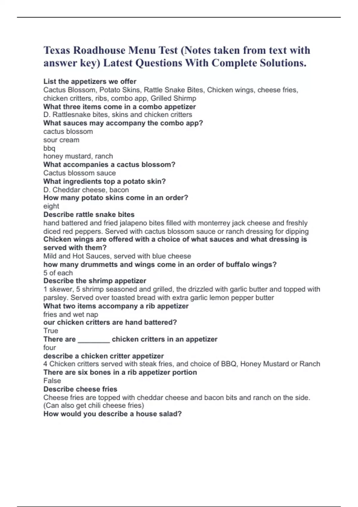Cactus Blossom, Potato Skins, Rattle Snake Bites, Chicken wings, cheese fries, chicken critters, ribs, combo app, Grilled Shirmp