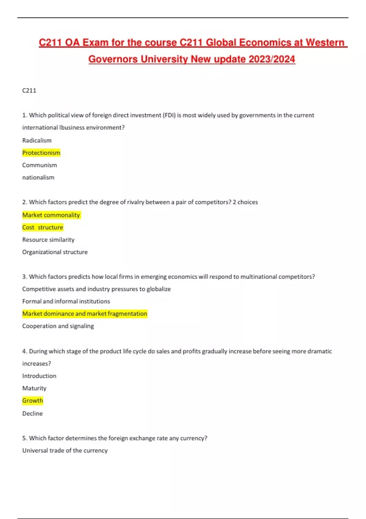 C211 OA Exam for the course C211 Global Economics at Western Governors University New update 2023/2024