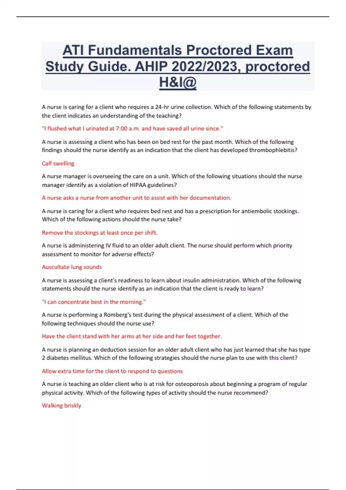 ATI Fundamentals Proctored Exam Study Guide. AHIP 2022/2023, proctored H&I@ 100% CORRECT