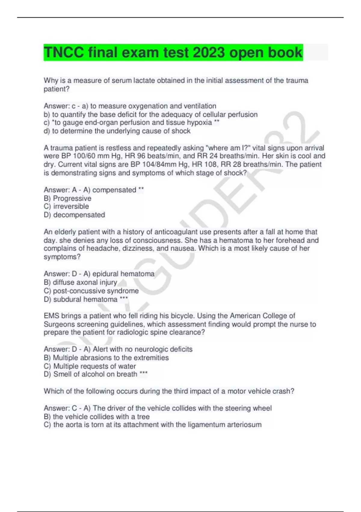 Why is a measure of serum lactate obtained in the initial assessment of the trauma patient? Answer: c - a) to measure oxygenation and ventilation b) to quantify the base deficit for the adequacy of cellular perfusion c) *to gauge end-organ perfusion and tissue hypoxia ** d) to determine the underlying cause of shock A trauma patient is restless and repeatedly asking "where am I?" vital signs upon arrival were BP 100/60 mm Hg, HR 96 beats/min, and RR 24 breaths/min. Her skin is cool and dry. Current vital signs are BP 104/84mm Hg, HR 108, RR 28 breaths/min. The patient is demonstrating signs and symptoms of which stage of shock? Answer: A - A) compensated ** B) Progressive C) irreversible D) decompensated An elderly patient with a history of anticoagulant use presents after a fall at home that day. she denies any loss of consciousness. She has a hematoma to her forehead and complains of headache, dizziness, and nausea. Which is a most likely cause of her symptoms? Answer: D - A) epidural hematoma B) diffuse axonal injury C) post-concussive syndrome D) subdural hematoma *** EMS brings a patient who fell riding his bicycle. Using the American College of Surgeons screening guidelines, which assessment finding would prompt the nurse to prepare the patient for radiologic spine clearance? Answer: D - A) Alert with no neurologic deficits B) Multiple abrasions to the extremities C) Multiple requests of water D) Smell of alcohol on breath *** Which of the following occurs during the third impact of a motor vehicle crash? Answer: C - A) The driver of the vehicle collides with the steering wheel B) the vehicle collides with a tree C) the aorta is torn at its attachment with the ligamentum arteriosum TNCC final exam test 2023 open book D) the airbag deploys and strikes the front seat passenger *** A passenger is brought to the emergency department of a rural hospital following a high-speed MVC. When significant abdominal and pelvic injuries are noted in the primary survey, which of the following is the priority interventions? Answer: A - A) initiate transfer to a trauma center ** B) provide report to the operating room nurse C) Obtained imaging studies D) Place a gastric tube Which of the following injuries is LEAST likely to be promptly identified? Answer: C - A) spleen B) lung C) bowel *** D) brain Patients with a crush injury should be monitored for which of the following conditions? Answer: C - A) Hypernatremia B) Hypercalcemia C) Dysrhthmias ** D) polyuria What finding raises suspicion of complete spinal cord injury? Answer: B - A) Weakness in the lower extremities B) Priapism *** C) voluntary anal sphincter tone D) intact reflexes distal to the injury A patient with a complete spinal cord injury in neurogenic shock will demonstrate hypotension and which other clinical signs? Answer: D - A) Bradycardia and ipsilateral absences of motor function B) Tachycardia and respiratory depression C) Tachycardia and absent motor function below the level of injury D) Bradycardia and absent motor function below the level of the injury *** A 5-year old child presents to the ED with bruises to the upper arms and buttocks in various stages of healing and multiple small, clean, round burns to the back. There are no abnormalities found based on the pediatric assessment triangle or primary survey. Which of the following is the priority nursing intervention?