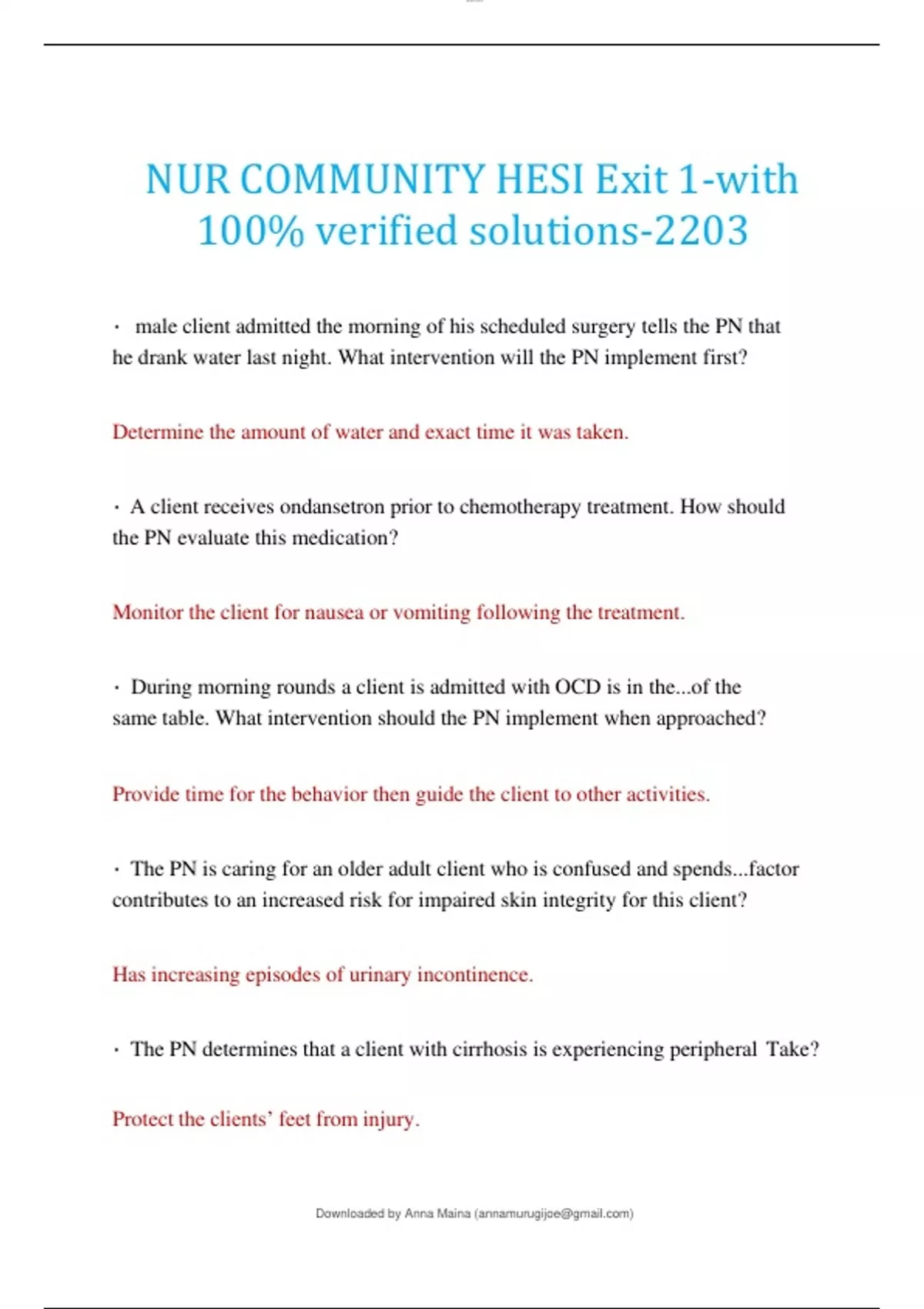 lOMoAR cPSD|12263423 Downloaded by Anna Maina () NUR COMMUNIT Y HESI Exit 1-with 100% verified solutions -2203 • male client admitted the morning of his scheduled surgery tells the PN that he drank water last night. What intervention will the PN implement first? Determine the amount of water and exact time it was taken. • A client receives ondansetron prior to chemotherapy treatment. How should the PN evaluate this medication? Monitor the client for nausea or vomiting following the treatment. • During morning rounds a client is admitted w ith OCD is in the...of the same table. What intervention should the PN implement when approached? Provide time for the behavior then guide the client to other activities. • The PN is caring for an older adult client who is confused and spends...factor contributes to an increased risk for impaired skin integrity for this client? Has increasing episodes of urinary incontinence. • The PN determines that a client with cirrhosis is experiencing peripheral Take? Protect the clients’ feet from injury. lOMoAR cPSD|12263423 Downloaded by Anna Maina () 7. A client is admitted to the postoperative surgical unit after a left lobectomy with two chest tubes ..... observes the water -sealed chambers, set and prescribed suction of 20cm water what action should the PN implement? Maintain system integrity and to promote lung expansion. 8. Photo of chest and locating apical HR. Just below the left nipple. 9. At the end of a 12-hour shift the PN observes the urine in a client’s drainage. What action should the PN take next? Note the most recent white blood count. 10. A client with a compound fracture of the left ankle is being discharged with a below the knee cast PN provide to the client prior to discharge? Never scratch under the cast. 11. Thirty minutes after receiving IV morphine, a postoperative male client continues to rate his pain. what action should the PN implement first? lOMoAR cPSD|12263423 Downloaded by Anna Maina () Implement complementary pain relief methods. 12. A male client has been diagnosed with schizophrenia is withdrawn, isolates himself in................................. ................................ ................................ ........ with one or two word responses. The morning the PN observes that he Which intervention is most important for the PN to implement? Measure appropriate vital signs. 13. The PN is assisting an unsteady client to ambulate from the bed to the bath. client loses balance and falls onto the bedside table. What action should the PN take first? Stay with the client and call for assistance. 14. The PN is assisting a female client to obtain a voided specimen for Uri meatus. Which intervention is performed next? Initiate the urine stream? 15. ................................ ................................ ................................ ................. An 8- year-old is placed in 90-90 traction for a fractured femur that resulted from .................................................................................................................further action by the PN? lOMoAR cPSD|12263423 Downloaded by Anna Maina () Weights are touching the foot of the bed. 16. The PN is reviewing diet instructions with a female client who has hypershe has increased her intakes of protein and calories. What action should the PN take? Encourage the client to continue the dietary changes she has made 17. A 3-year-old child returns to the pediatrician’s office for a postoperative visit after having...procedure. The PN shoul d expect to observe which behavior that indicates... Plays doctor and nurse with the dolls 18. The PN reviews the procedure for measuring fluid intake and output glomerulonephritis and is preparing for discharge from the hospital. What... -why the fluid measurements need to be recoded -which food types are included when measuring fluid take -what container to use for the most accurate measurement
