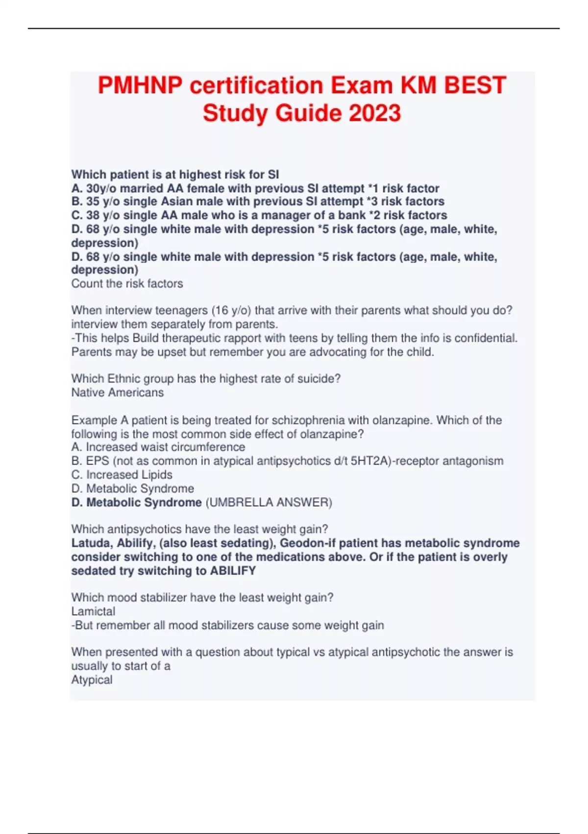 Which patient is at highest risk for SI A. 30y/o married AA female with previous SI attempt *1 risk factor B. 35 y/o single Asian male with previous SI attempt *3 risk factors C. 38 y/o single AA male who is a manager of a bank *2 risk factors D. 68 y/o single white male with depression *5 risk factors (age, male, white, depression) D. 68 y/o single white male with depression *5 risk factors (age, male, white, depression) Count the risk factors When interview teenagers (16 y/o) that arrive with their parents what should you do? interview them separately from parents. -This helps Build therapeutic rapport with teens by telling them the info is confidential. Parents may be upset but remember you are advocating for the child. Which Ethnic group has the highest rate of suicide? Native Americans Example A patient is being treated for schizophrenia with olanzapine. Which of the following is the most common side effect of olanzapine? A. Increased waist circumference B. EPS (not as common in atypical antipsychotics d/t 5HT2A)-receptor antagonism C. Increased Lipids D. Metabolic Syndrome D. Metabolic Syndrome (UMBRELLA ANSWER) Which antipsychotics have the least weight gain? Latuda, Abilify, (also least sedating), Geodon-if patient has metabolic syndrome consider switching to one of the medications above. Or if the patient is overly sedated try switching to ABILIFY Which mood stabilizer have the least weight gain? Lamictal -But remember all mood stabilizers cause some weight gain When presented with a question about typical vs atypical antipsychotic the answer is usually to start of a Atypical A client presents with complains of changes in appetite, feeling fatigued, problems with sleep-rest cycle, and changes in libido. What is the neuroanatomical area of the brain that is responsible for the normal regulation of these functions? A. Thalamus B. Hypothalamus C. Limbic System D. Hippocampus Hypothalamus A, B, & D are all part of the limbic system so you can rule that out When a patient is hesitant to participate in treatment you should encourage? Bring a support person like a husband Thyroid-Stimulating hormone normal level 0.5-5.0 Mu/L When T4 and T3 are high and TSH is low what is the diagnosis HYPERTHYROIDISM, TSH secretion decreases: TSH LOW à key symptoms HEAT INTOLERANCE Key symptoms of Heat Intolerance Hyperthyroidism When T4 and T3 are Low and TSH is high what is the diagnosis (HYPOTHYROIDISM) TSH secretion increased: TSH HIGH à COLD INTERANCE Key symptoms of Cold Intolerance Hypothyroidism Hyperthyroid can mimic Mania Hypothyroid can mimic Depression A patient on depakote complains of RUQ pain and has reddish/brown urine Hepatoxicity -Check LFTs Signs of Depakote toxicity Disorientation, confusion, lethargy You suspect depakote toxicity what do you do? Check -LFT
