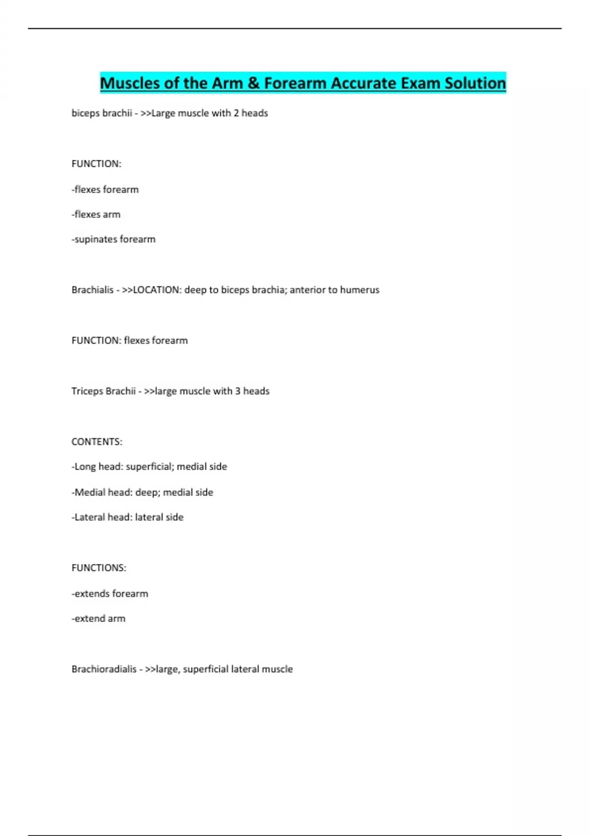 Muscles of the Arm & Forearm Accurate Exam Solution biceps brachii - >>Large muscle with 2 heads FUNCTION: -flexes forearm -flexes arm -supinates forearm Brachialis - >>LOCATION: deep to biceps brachia; anterior to humerus FUNCTION: flexes forearm Triceps Brachii - >>large muscle with 3 heads CONTENTS: -Long head: superficial; medial side -Medial head: deep; medial side -Lateral head: lateral side FUNCTIONS: -extends forearm -extend arm Brachioradialis - >>large, superficial lateral muscle FUNCTION: -flexes forearm -pronates forearm supinates forearm Pronator teres - >>LOCATION: lateral to brachioradialis FUNCTION: -pronates forearm -flexes forearm (weakly) Flexor carpi radialis - >>LOCAITON: medial and inferior to pronator teres; medial to brachioradialis in forearm FUNCTION: -flexes hand -abducts hand Palmaris longus - >>LOCATION: