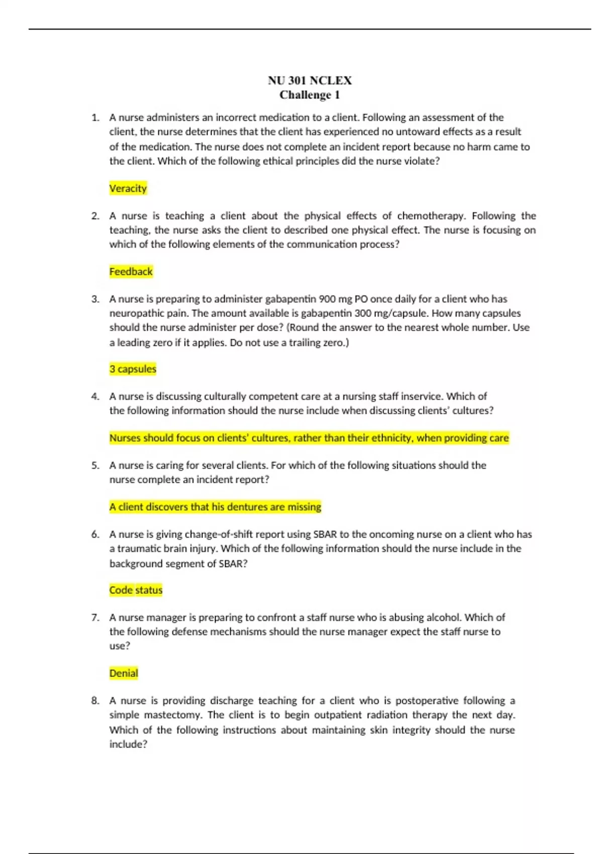 NU 301 NCLEX Challenge 1 1. A nurse administers an incorrect medication to a client. Following an assessment of the client, the nurse determines that the client has experienced no untoward effects as a result of the medication. The nurse does not complete an incident report because no harm came to the client. Which of the following ethical principles did the nurse violate? Veracity 2. A nurse is teaching a client about the physical effects of chemotherapy. Following the teaching, the nurse asks the client to described one physical effect. The nurse is focusing on which of the following elements of the communication process? Feedback 3. A nurse is preparing to administer gabapentin 900 mg PO once daily for a client who has neuropathic pain. The amount available is gabapentin 300 mg/capsule. How many capsules should the nurse administer per dose? (Round the answer to the nearest whole number. Use a leading zero if it applies. Do not use a trailing zero.) 3 capsules 4. A nurse is discussing culturally competent care at a nursing staff inservice. Which of the following information should the nurse include when discussing clients’ cultures? Nurses should focus on clients’ cultures, rather than their ethnicity, when providing care 5. A nurse is caring for several clients. For which of the following situations should the nurse complete an incident report? A client discovers that his dentures are missing 6. A nurse is giving change-of-shift report using SBAR to the oncoming nurse on a client who has a traumatic brain injury. Which of the following information should the nurse include in the background segment of SBAR? Code status 7. A nurse manager is preparing to confront a staff nurse who is abusing alcohol. Which of the following defense mechanisms should the nurse manager expect the staff nurse to use? Denial 8. A nurse is providing discharge teaching for a client who is postoperative following a simple mastectomy. The client is to begin outpatient radiation therapy the next day. Which of the following instructions about maintaining skin integrity should the nurse include? Do not apply heat to the area of irradiation 9. When reviewing the admitting prescriptions for a client, the nurse notes that the dose of one medication is three times the usual dose of this medication. Which of the following actions should the nurse take? Contact the provider to question the dosage 10. A nurse is caring for a client who has cancer and is scheduled for immediate chemotherapy. The client tells the nurse that she wants to try nontraditional treatments first. Which of the following responses should the nurse make? “Tell me more about your concerns about taking chemotherapy.” 11. A nurse is preparing to administer morphine 4 mg IV bolus to a client who reports pain. Available is morphine 10 mg/mL. Which of the following actions should the nurse take? Have another nurse witness the disposal of the extra medication 12. A nurse is caring for a client who has fallen while getting out of bed and states, “I’m okay! I guess I should have called for help to the bathroom.” After assessing the client, the nurse notifies the provider. Which of the following documentation should the nurse include in the client’s medical record? “The provider was notified.” 13. A nurse manager is presenting to a group of unit nurses the categories regulated under the Controlled Substances Act. Which of the following medication prescriptions should the nurse include under Schedule II? Morphine 14. A nurse is caring for a client who is receiving radiation therapy to treat lung cancer. Which of the following actions should the nurse take? Observe for signs of infection 15. A nurse manager has recently become aware of a conflict between the pharmacy and the staff nurses regarding sending and receiving medications. Which of the following actions should the nurse take first to resolve the conflict? Identify the problem 16. A nurse is talking with a client who is about to start using transcutaneous electrical nerve stimulation (TENS) to manage chronic pain. Which of the following statements should the nurse identify as an indication that the client needs further teaching?