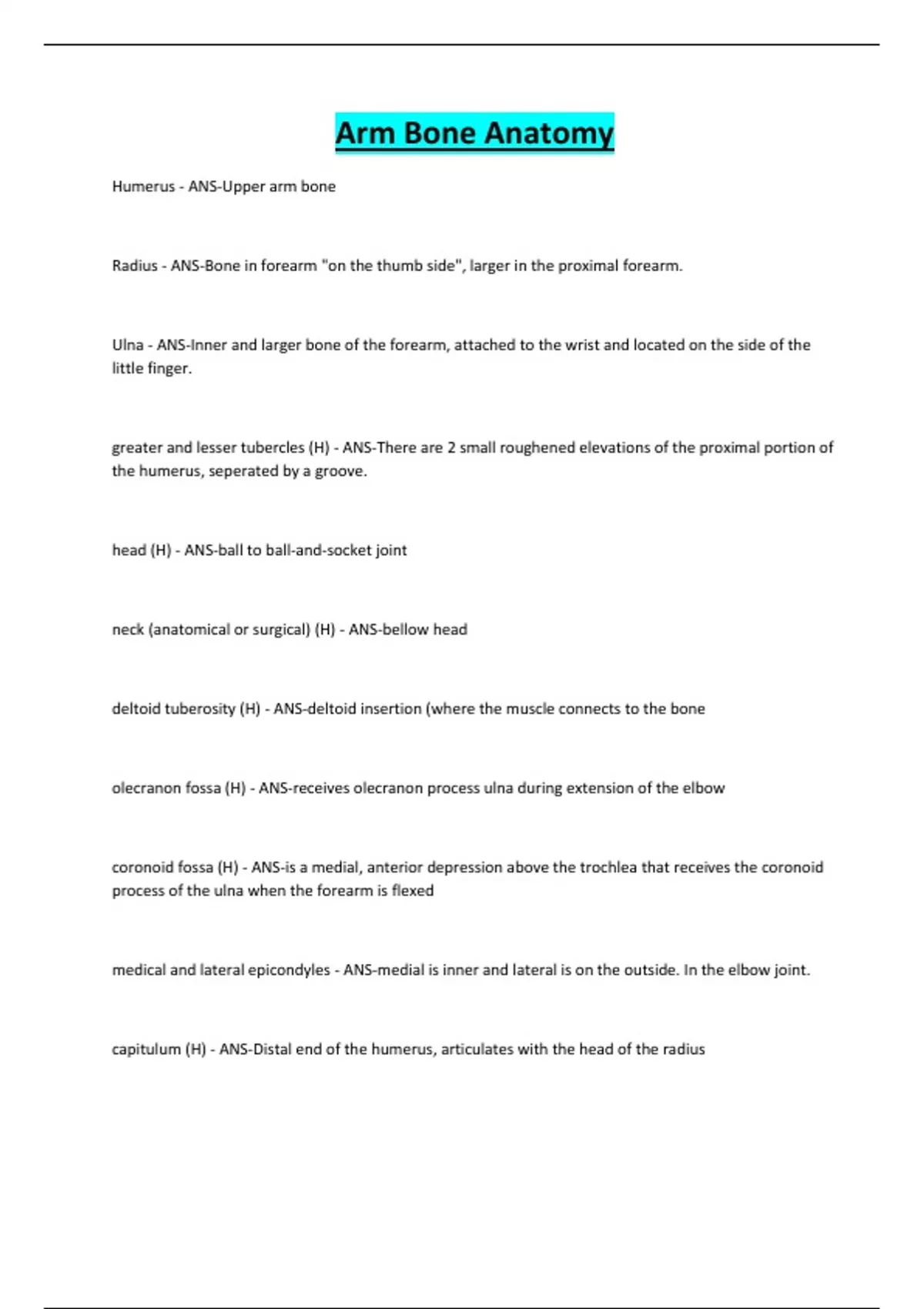 Arm Bone Anatomy Humerus - ANS-Upper arm bone Radius - ANS-Bone in forearm "on the thumb side", larger in the proximal forearm. Ulna - ANS-Inner and larger bone of the forearm, attached to the wrist and located on the side of the little finger. greater and lesser tubercles (H) - ANS-There are 2 small roughened elevations of the proximal portion of the humerus, seperated by a groove. head (H) - ANS-ball to ball-and-socket joint neck (anatomical or surgical) (H) - ANS-bellow head deltoid tuberosity (H) - ANS-deltoid insertion (where the muscle connects to the bone olecranon fossa (H) - ANS-receives olecranon process ulna during extension of the elbow coronoid fossa (H) - ANS-is a medial, anterior depression above the trochlea that receives the coronoid process of the ulna when the forearm is flexed medical and lateral epicondyles - ANS-medial is inner and lateral is on the outside. In the elbow joint. capitulum (H) - ANS-Distal end of the humerus, articulates with the head of the radius CONTINUES...