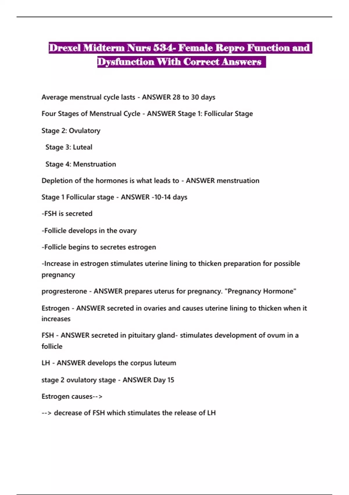 Drexel Midterm Nurs 534- Female Repro Function and Dysfunction With Correct Answers...