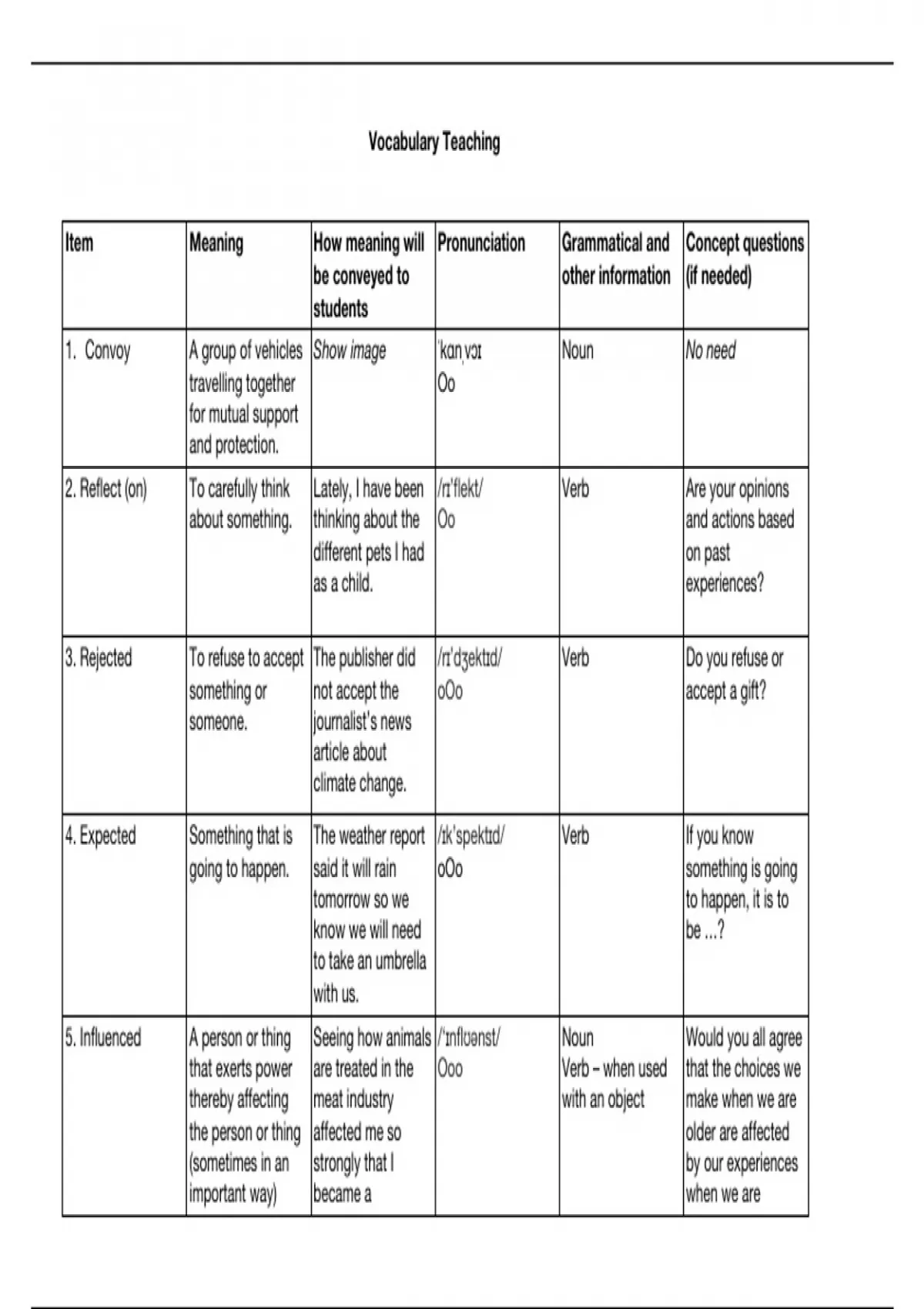 Summary Assignment A. Vocabulary Teaching table