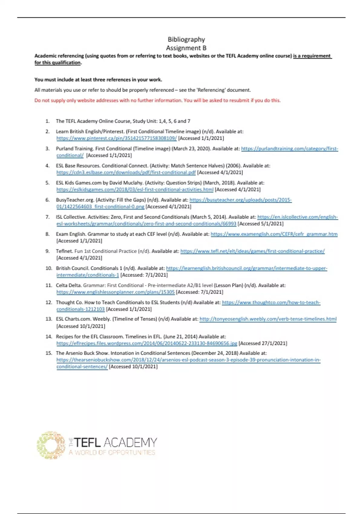 TEFL Academy. Assignment B. Bibliography. TEFL Level 5. Merit Standard