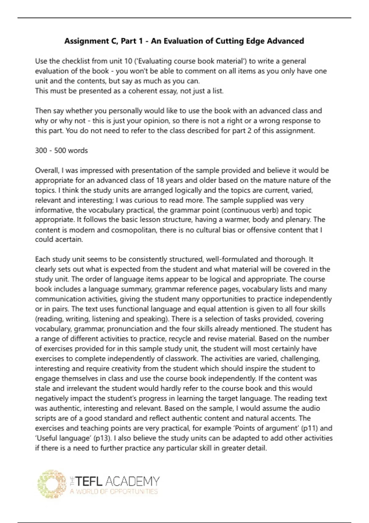 TEFL Academy. Assignment C. Part 1 Evaluation. TEFL Level 5. Merit Standard